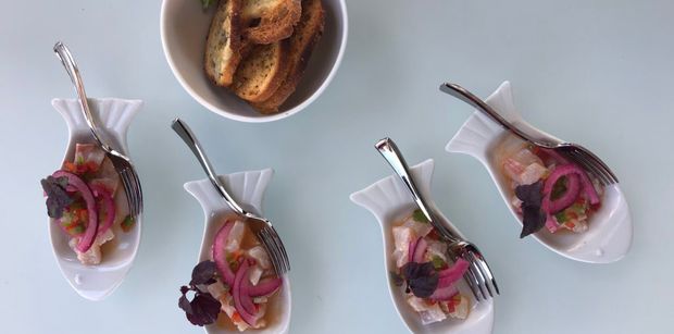 Josué prepared wonderful canapés including gazpacho shot with oregano toast, Mediterranean bruschetta with kalamata olives, lemong, fleur de sel, olive oil and basil sprout, creme brûlée parmigiano, ceviche and chicken breast marinated in sesame oil wrapped in bacon.