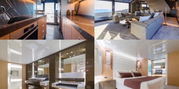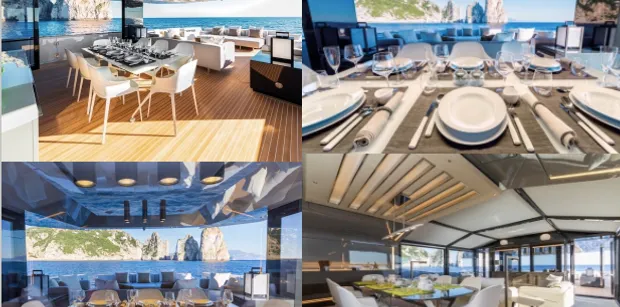 The yacht has a stunning contemporary feel and her full beach master cabin is truly impressive with his ‘N hers sinks and large walk-in shower. The saloon area is bright with lots of natural light flooding in and leads onto her exterior dining area which is complemented by sofas and sun pads!