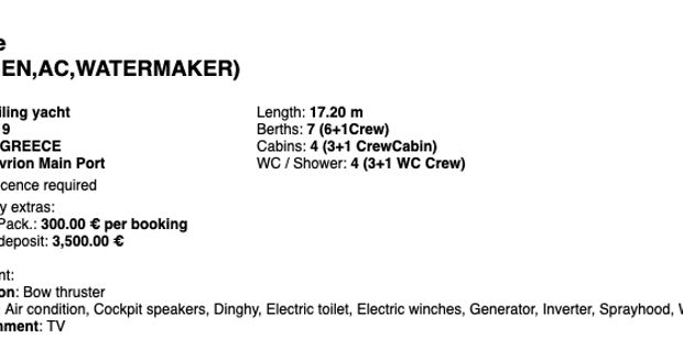 • Under the title, you then have various bits of information like where the yachts home is “Base: Lavrion Main Port”, how many cabins, length, and prices etc.