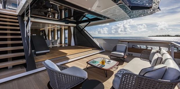 Her striking ‘glass lounge’ created by large 45-degree glass doors leading from the main salon to aft deck, creates quite the welcome spectacle.