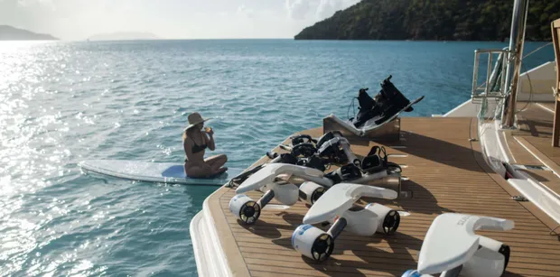 Chartering with EMYSA promises the perfect balance of luxury and adventure. Enjoy a personal espresso machine in the master suite before stepping out to the expansive foredeck where cozy beanbags and stunning views of Tortola await. Grab a paddle and take advantage of the crystal clear waters, spotting brightly colored fish and corals along the way. With the see-through paddle board, you’ll explore the world below, from above.