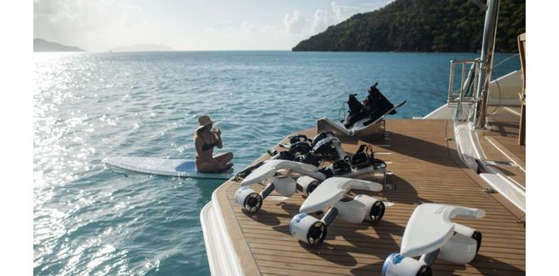 Chartering with EMYSA promises the perfect balance of luxury and adventure. Enjoy a personal espresso machine in the master suite before stepping out to the expansive foredeck where cozy beanbags and stunning views of Tortola await. Grab a paddle and take advantage of the crystal clear waters, spotting brightly colored fish and corals along the way. With the see-through paddle board, you’ll explore the world below, from above.