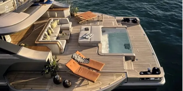 This Benetti features an expansive main deck aft, which is the heart of life on board. You’ll find a generous U-shaped sofa, sun loungers, daybeds, and an inviting Jacuzzi infinity pool. Fold down terraces at water level create a true beach club atmosphere, ideal for morning swims, relaxed afternoons in the sun, and sunset cocktails at anchor off Mykonos.