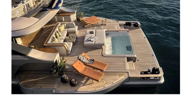 This Benetti features an expansive main deck aft, which is the heart of life on board. You’ll find a generous U-shaped sofa, sun loungers, daybeds, and an inviting Jacuzzi infinity pool. Fold down terraces at water level create a true beach club atmosphere, ideal for morning swims, relaxed afternoons in the sun, and sunset cocktails at anchor off Mykonos.