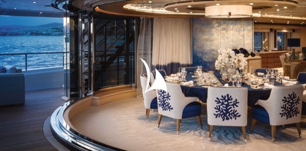 For dinner, CLOUD 9 offers an unrivalled setting. The circular table enjoys the comfort and warmth of inside in the intricate interior, yet the glass revolving doors offer panoramic views of the serene spot of anchorage. As you sample the creative cuisine your private chef provides, you can feel the gentle summer breeze whilst getting a taste of local delights.