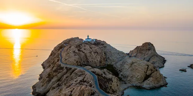 Aerial view of the Pietra Lighthouse at sunset, Ile-Rousse, Red Island Corsica, Corsica, France