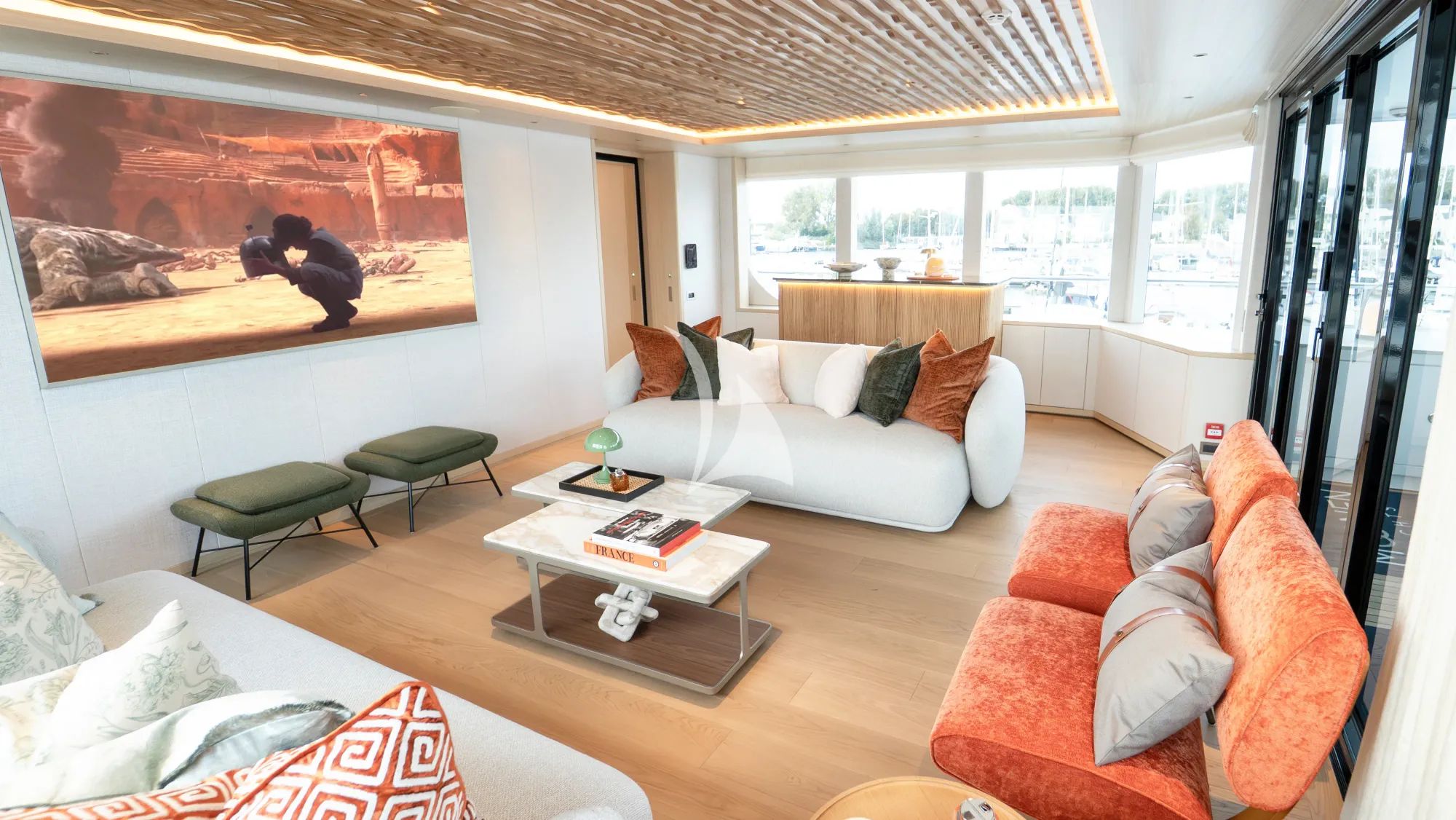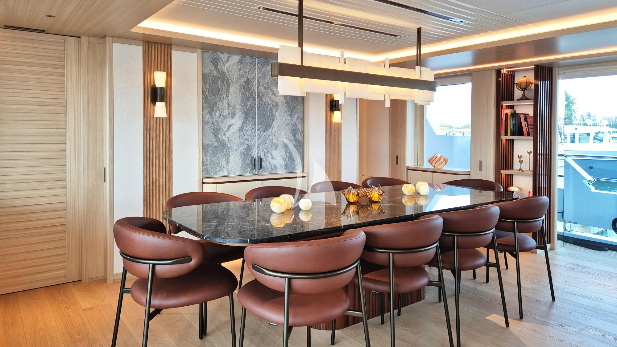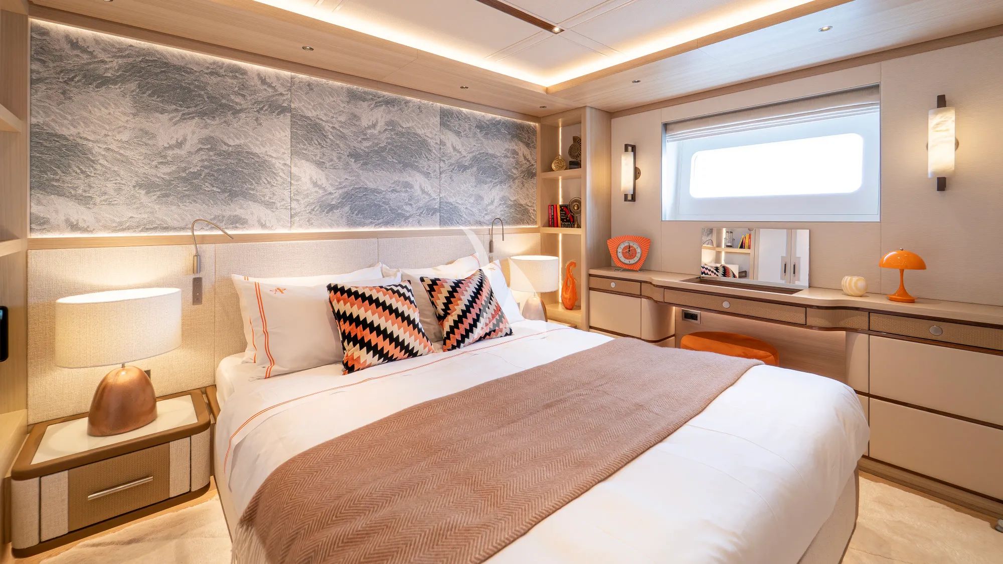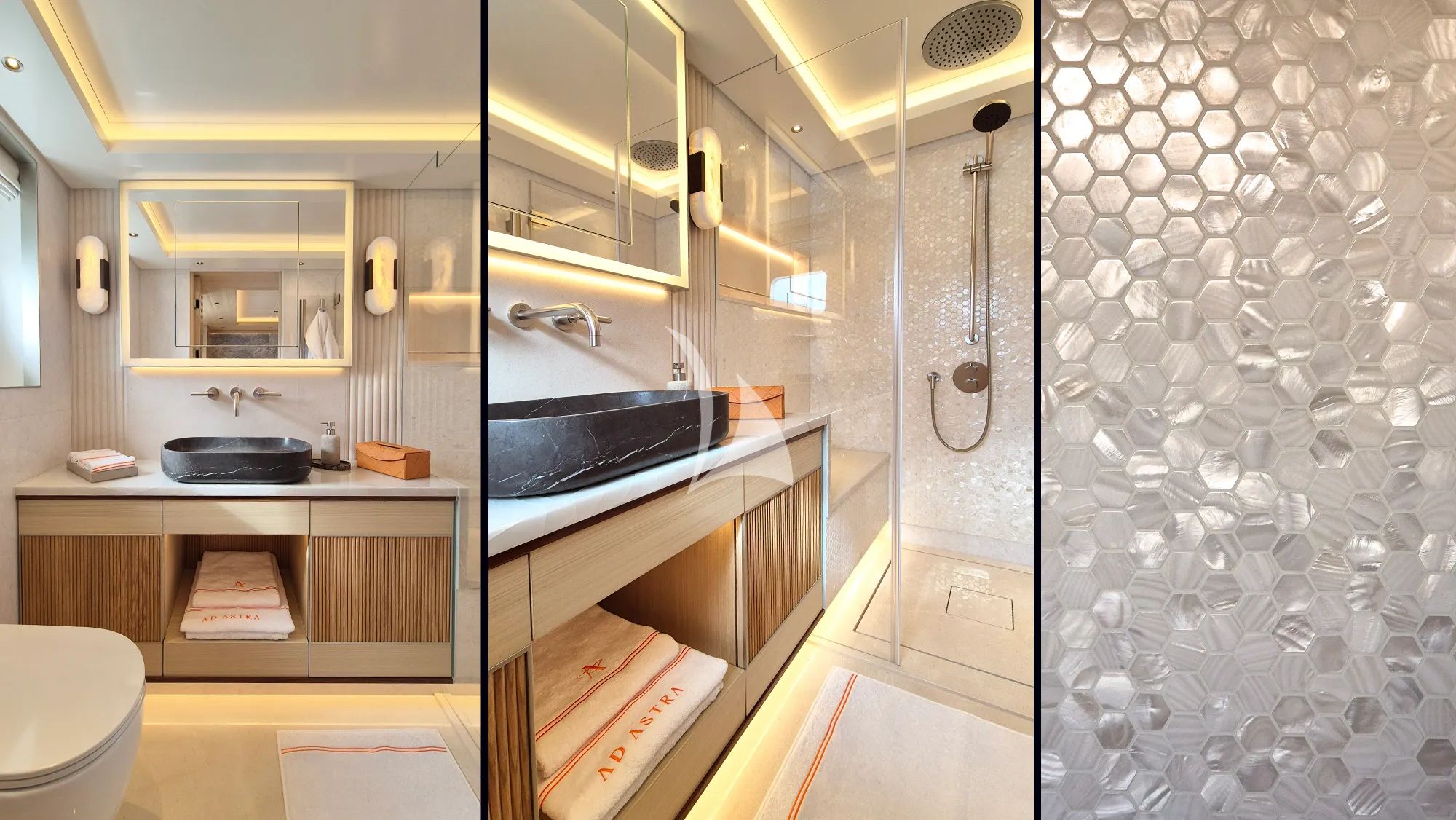 ADASTRA’s interior is a masterpiece of sophistication and comfort. The spacious saloon is bathed in natural light from her large windows, illuminating the contemporary furnishings and polished teak finishes. The dining area provides an elegant setting for intimate meals, while her private cabins offer cozy sanctuaries designed for deep relaxation.