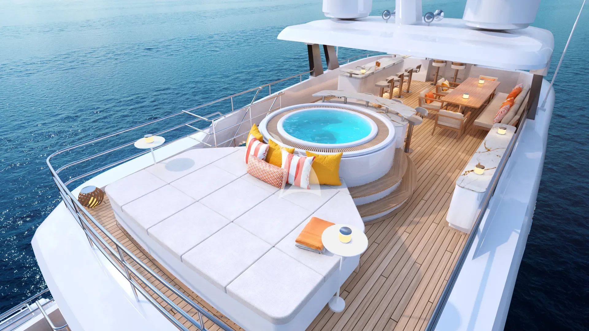 On the sundeck, unwind with a Piña Colada in hand while admiring sweeping views of Paradise Island. The gentle hum of the ocean and soft sway of the yacht set the perfect tone for conversation, laughter, and relaxation. Here, the bar and jacuzzi await! Dip into the bubbling waters as the tropical sun warms your skin, or simply lounge with a cool drink as the day drifts by in blissful slow motion.
