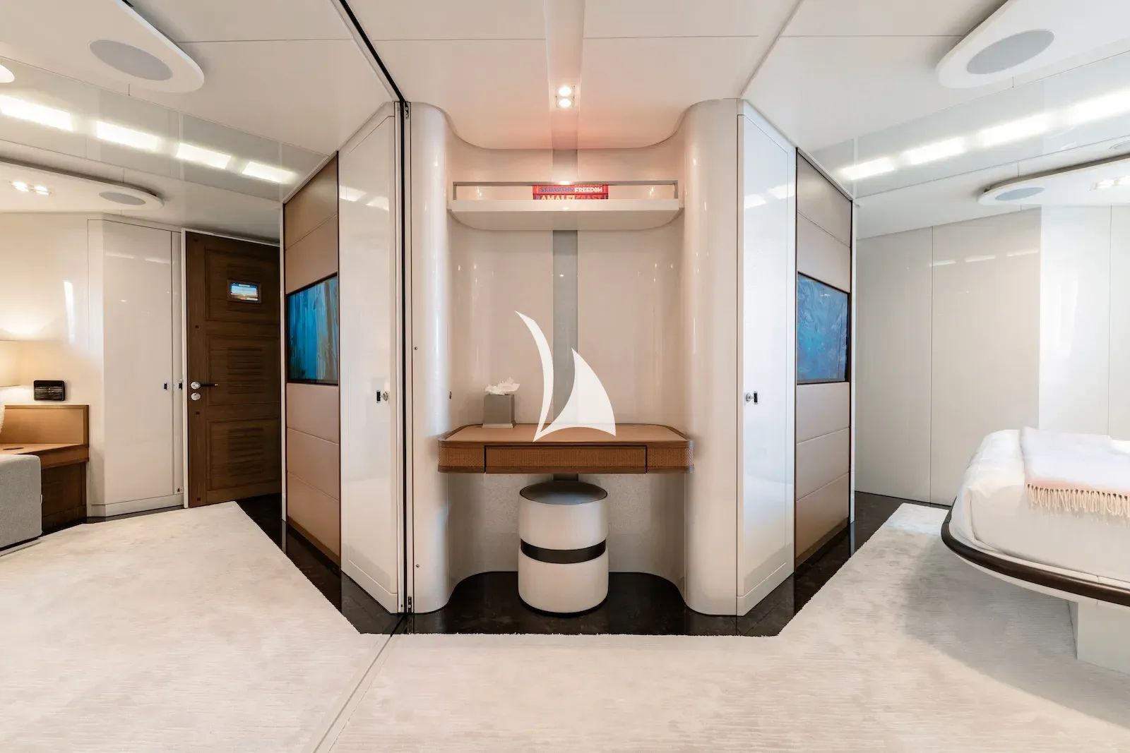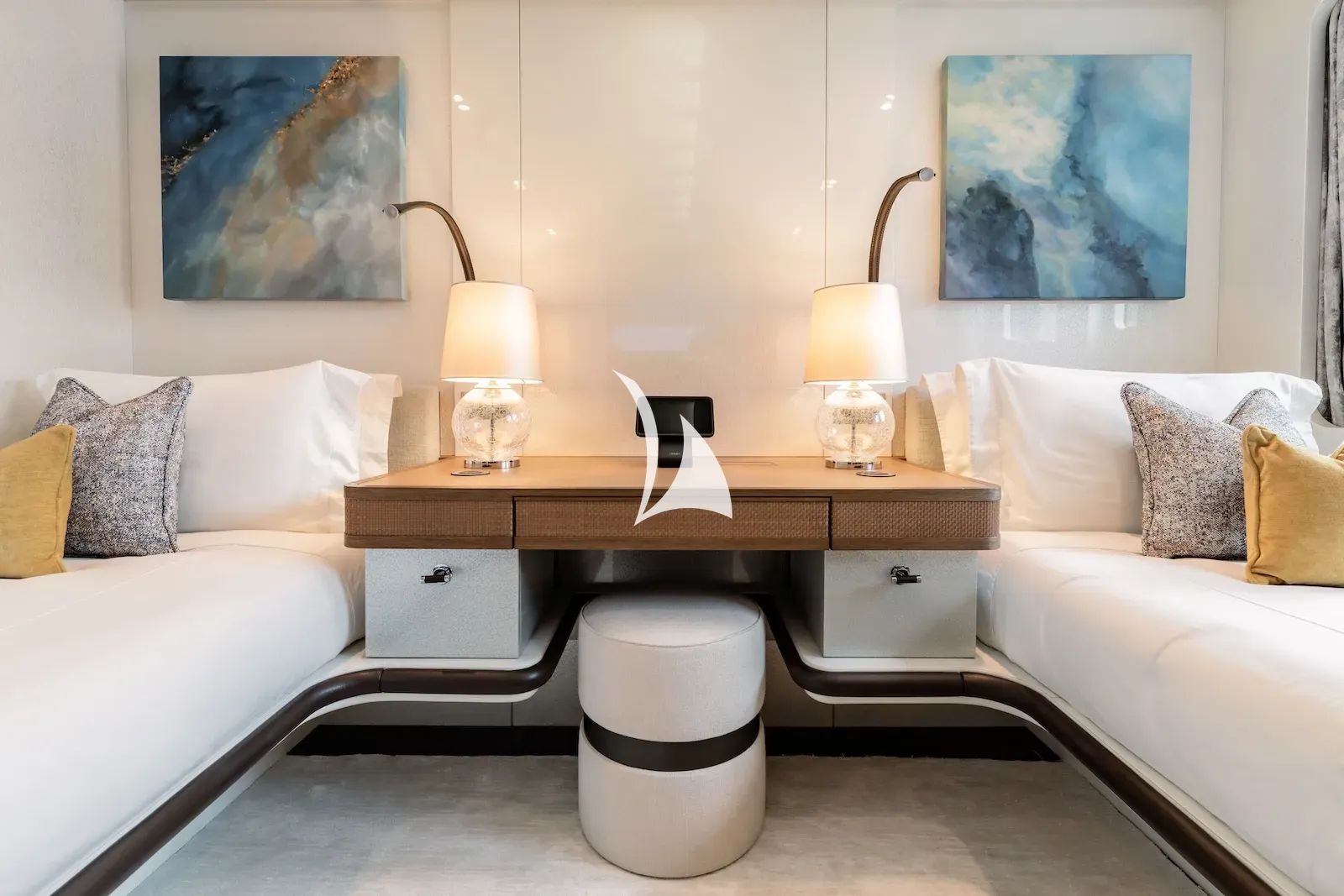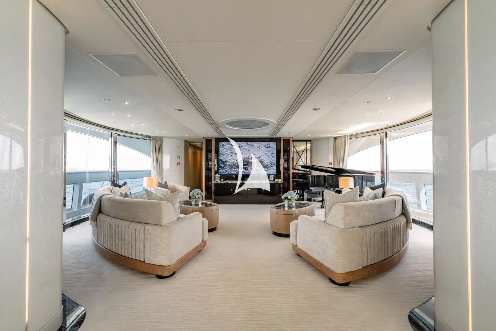 Aboard the interior spaces, natural light does much of the work in shaping the atmosphere, streaming through large windows and reflecting off glass balustrades to create a fresh, open feel. The main saloon is comfortable and refined without feeling formal, while the sky lounge offers another inviting area to gather, complete with a bar, cinema screen, and self-playing piano. Accommodation for up to 12 guests is arranged across six elegant en-suite staterooms, each offering privacy and ease at the end of the day. The master suite stands out with its two balconies with sunbeds, private office, and spacious lounge and bathroom, while the full-beam VIP stateroom can convert into two double cabins for added versatility.