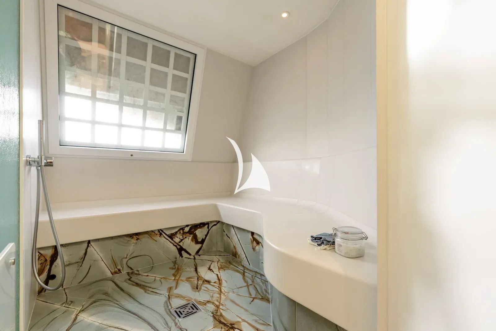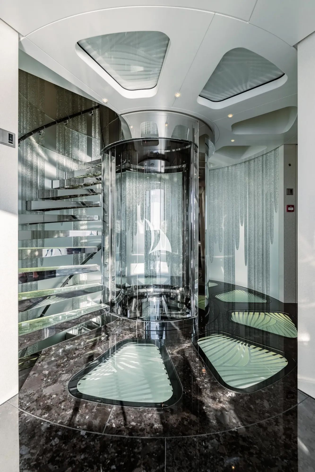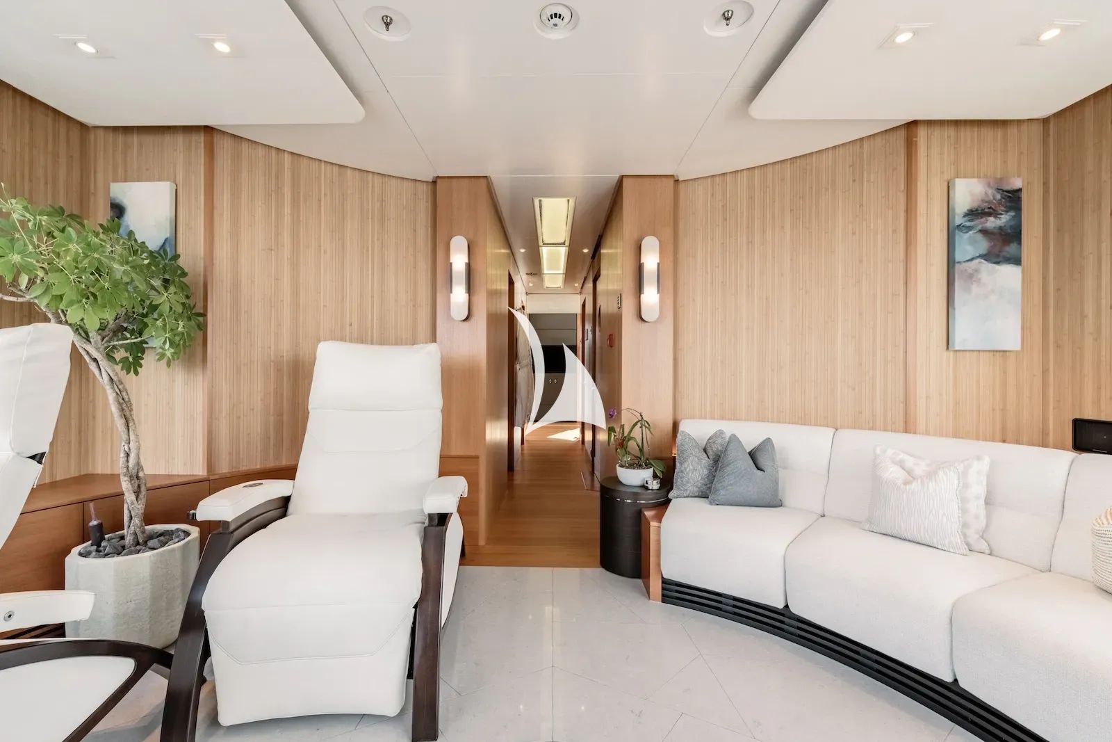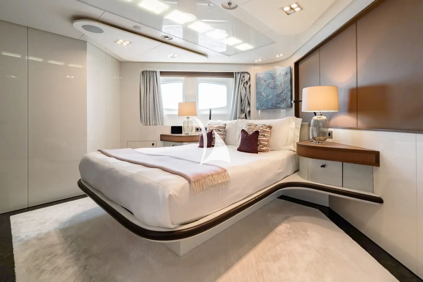 Aboard the interior spaces, natural light does much of the work in shaping the atmosphere, streaming through large windows and reflecting off glass balustrades to create a fresh, open feel. The main saloon is comfortable and refined without feeling formal, while the sky lounge offers another inviting area to gather, complete with a bar, cinema screen, and self-playing piano. Accommodation for up to 12 guests is arranged across six elegant en-suite staterooms, each offering privacy and ease at the end of the day. The master suite stands out with its two balconies with sunbeds, private office, and spacious lounge and bathroom, while the full-beam VIP stateroom can convert into two double cabins for added versatility.