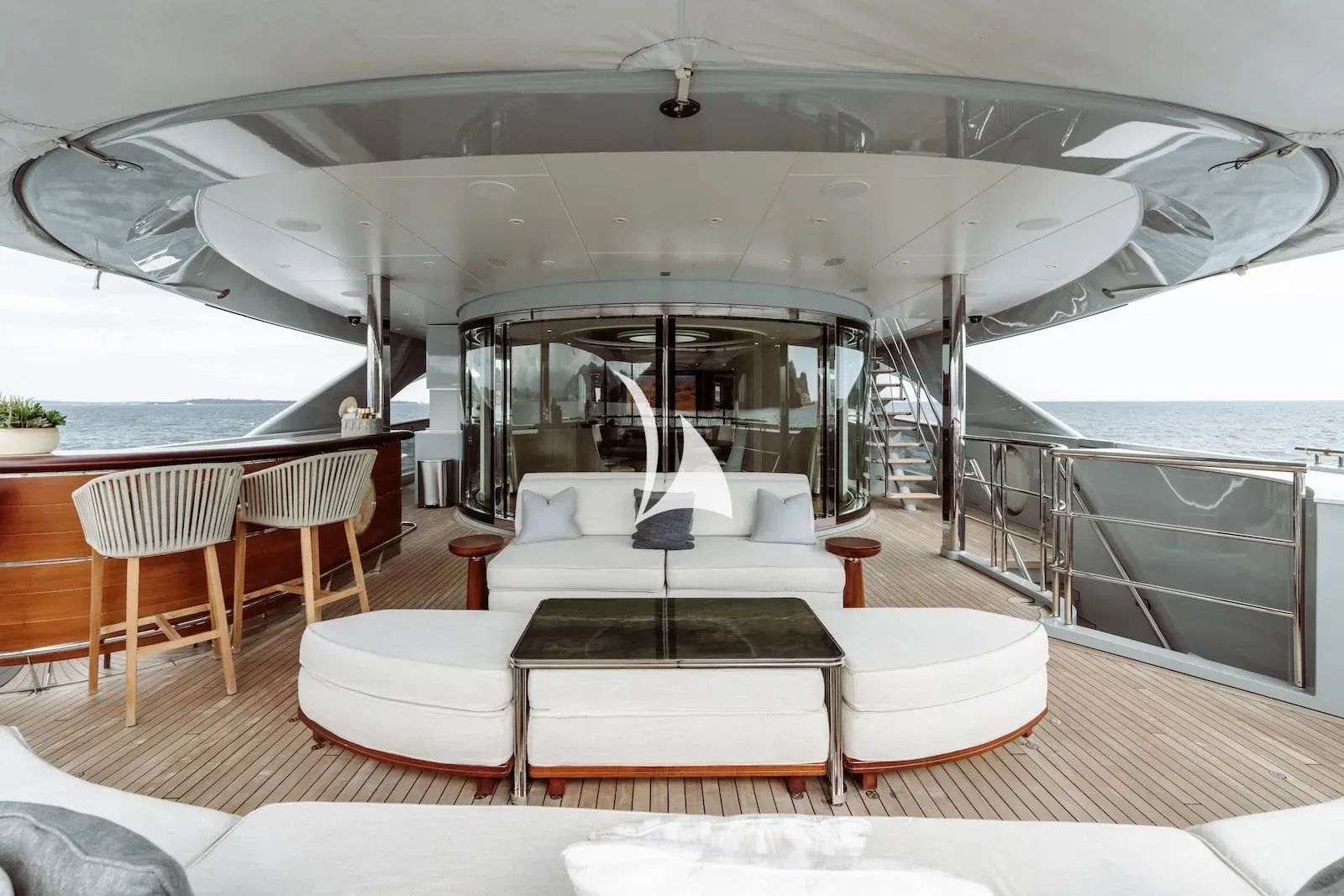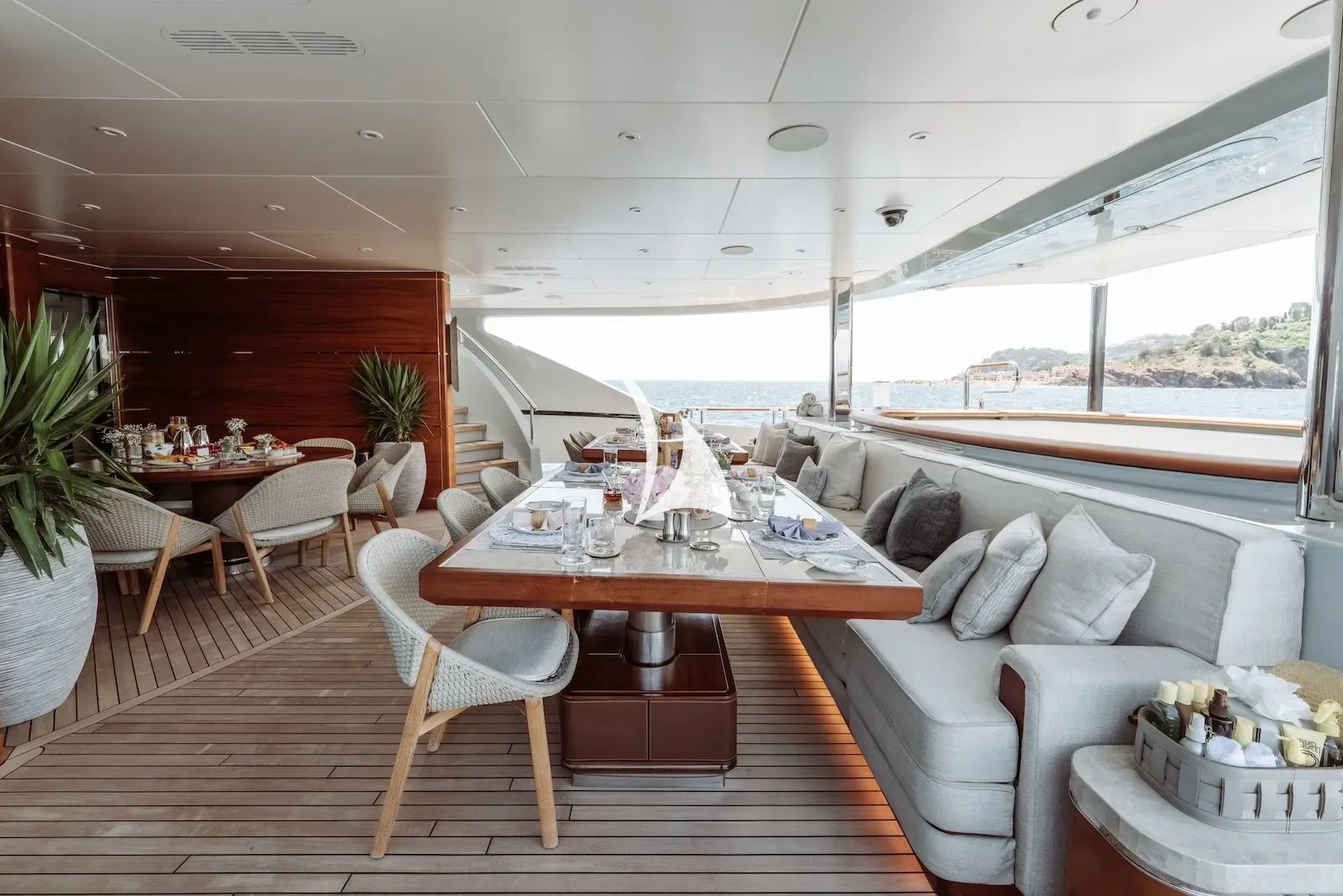Across four expansive decks, outdoor living becomes one of the great pleasures of the charter. The sundeck Jacuzzi offers a front-row seat to the scenery, while the main deck pool with its cascading waterfall creates a space that feels social, striking, and undeniably enjoyable. Two deck bars allow the mood to shift naturally from refreshing daytime drinks to sunset cocktails, and the alfresco dining areas make every meal feel more connected to the setting around you. Whether guests are enjoying the atmosphere near La Maddalena or taking in the scene around Porto Cervo, the outdoor arrangement encourages them to linger longer and enjoy the yacht at their own pace.