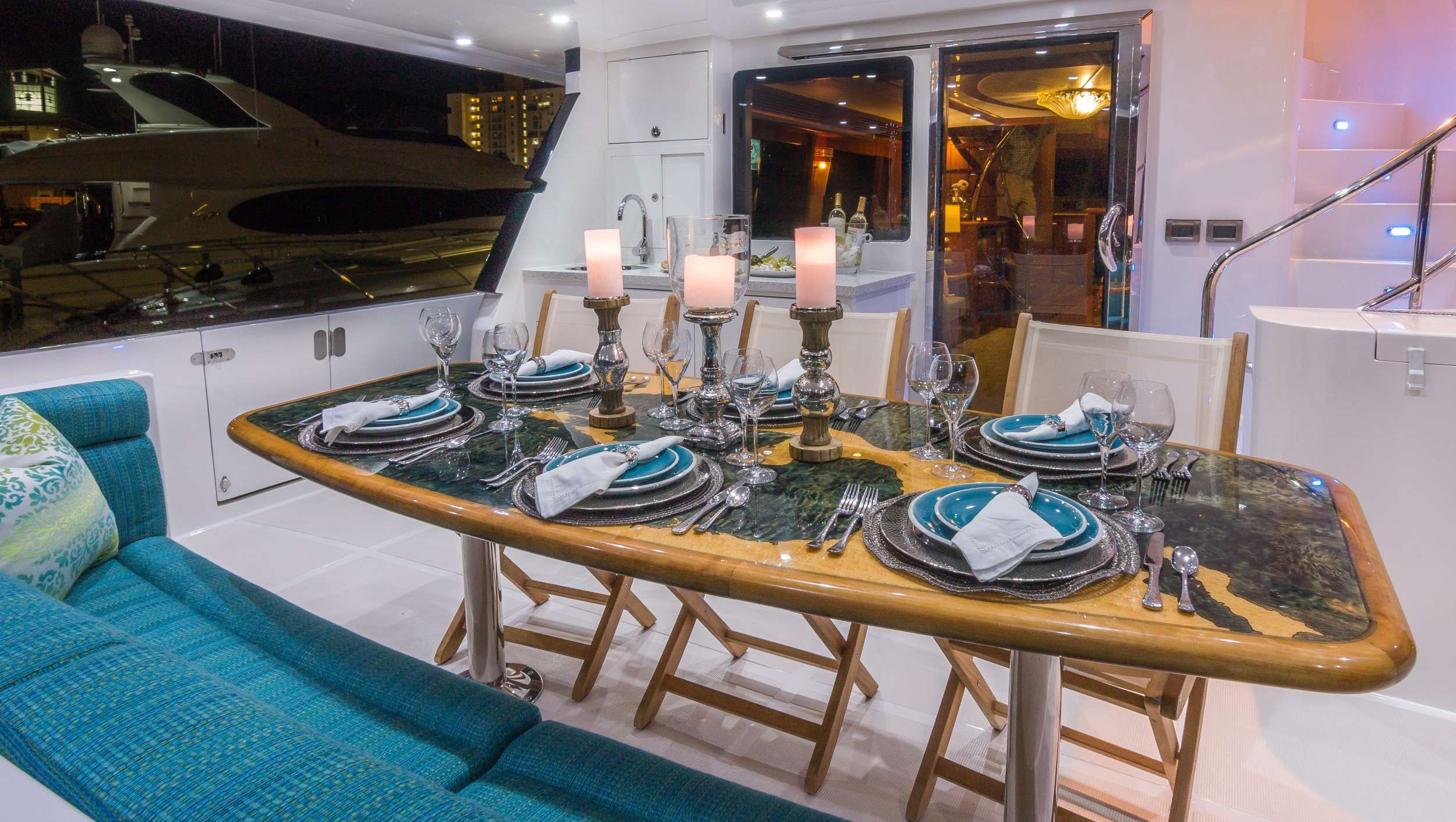 Outdoor living quickly becomes the heartbeat of the experience. Up on the flybridge, the open seating area aft turns into your go-to spot for a chilled drink, a shared playlist, and stories that last longer than planned as the Bahamas stretches out ahead. As the sun lowers, the aft deck transforms into an effortless dining scene, where a 5-star menu is served beneath a Bahamian sunset and assorted seafood delights become the highlight of the evening, paired with warm breezes and that golden hour glow. When the next morning arrives, you will likely find yourself drawn to the foredeck first, stretching out on the cushioned sunbathing area with wide Exumas views all around you, then heading down to the spacious swim platform where an assortment of water toys is set up and ready, inviting you straight into the water.