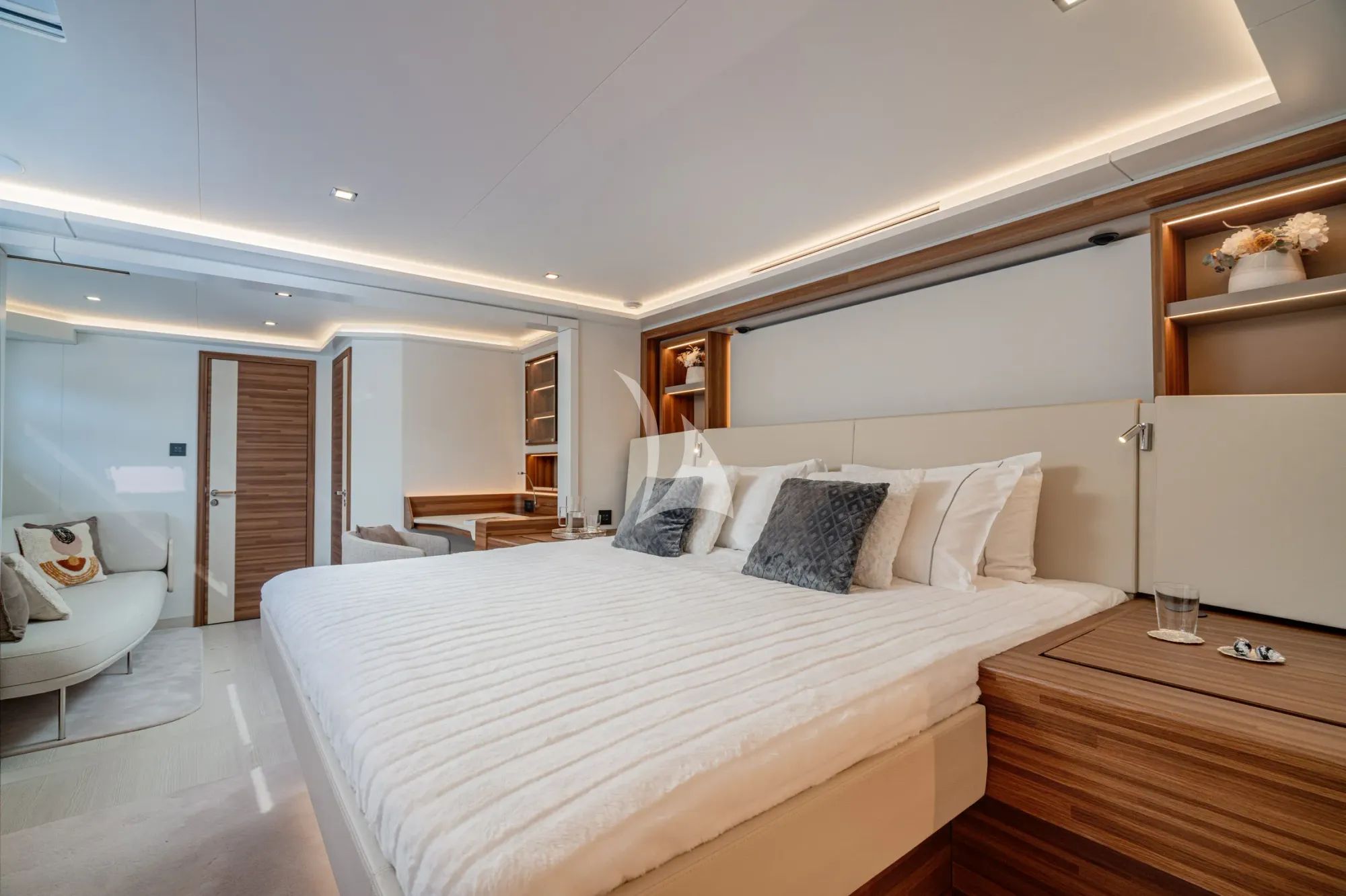 The interior continues the sense of thoughtful design with a spacious and contemporary layout suited to socializing at any hour. Cabins are finished with teak details that bring warmth to each space, and private bathrooms ensure comfort throughout the journey. The master cabin offers additional refinement with a king bed, lounge area, LED TV, dedicated work space, and a spa-inspired bathroom that encourages true relaxation.
