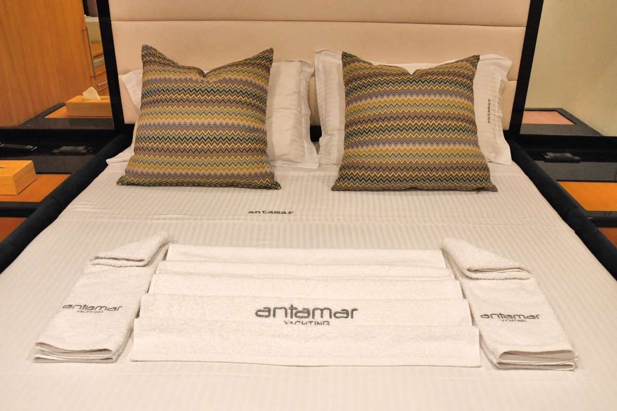Inside, ANTAMAR II welcomes you with an elegant layout enhanced by natural light pouring in through her glass windows. Her saloon and dining area form a warm, stylish setting for indoor celebrations or quiet evenings. Each cabin with its own private bathroom provides comfort and privacy, making your stay feel seamless from day to night.