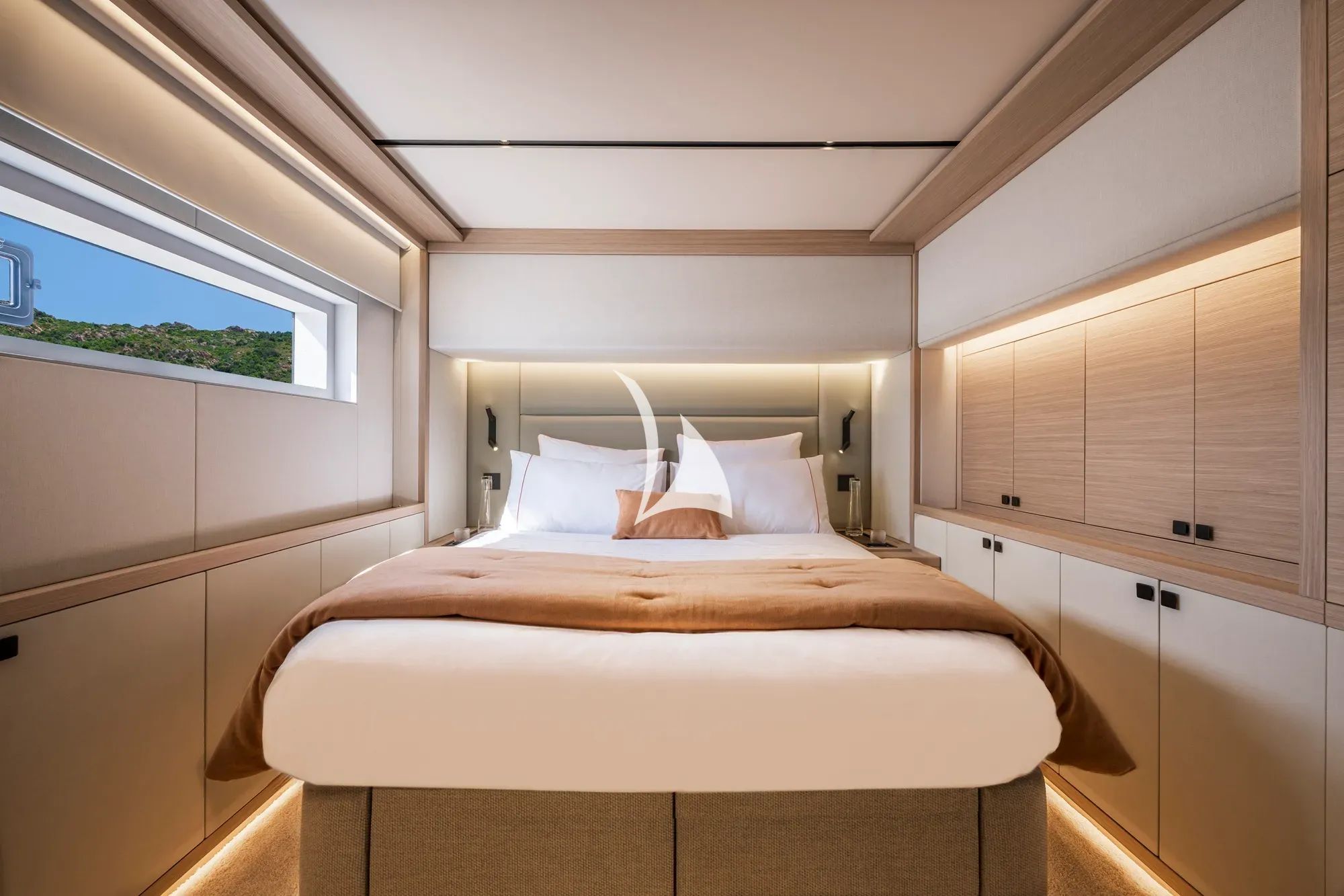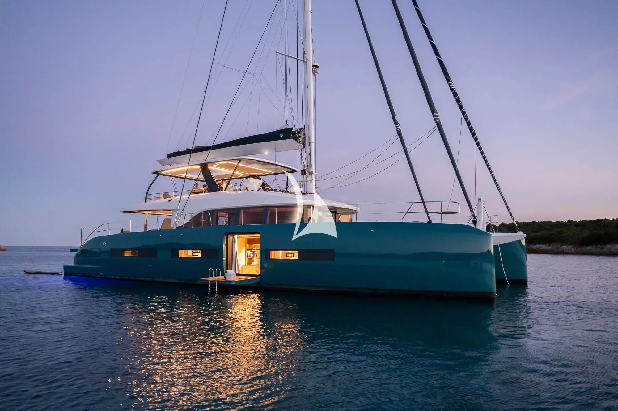 There is a playful elegance to ARKTOS that feels immediately suited to Riviera cruising. Built on the innovative platform of the Lagoon Eighty 2, she combines a sleek teal blue exterior with smooth, stable performance on the water. Her layout encourages movement between shared spaces and quiet retreats, creating a relaxed flow throughout the yacht. Designed for 12 guests, she delivers comfort without compromising a sense of openness.