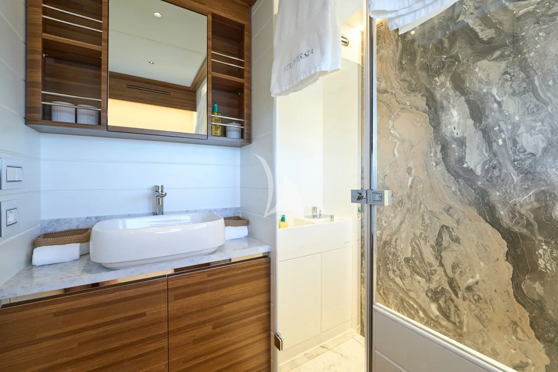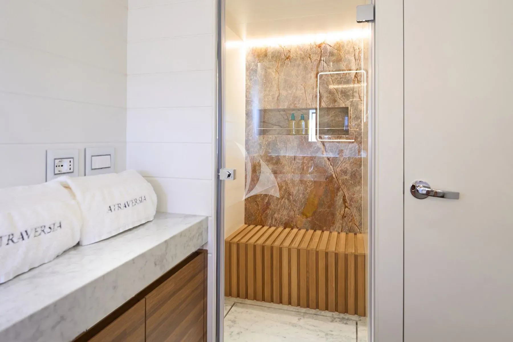 ATRAVERSIA exudes modern elegance, featuring a luminous saloon and dining area ideal for hosting upscale celebrations. Each of her luxuriously designed cabins, adorned with teak finishes and white accents, offers a sanctuary of comfort, complete with private ensuite facilities to ensure a restful retreat after days filled with adventure.