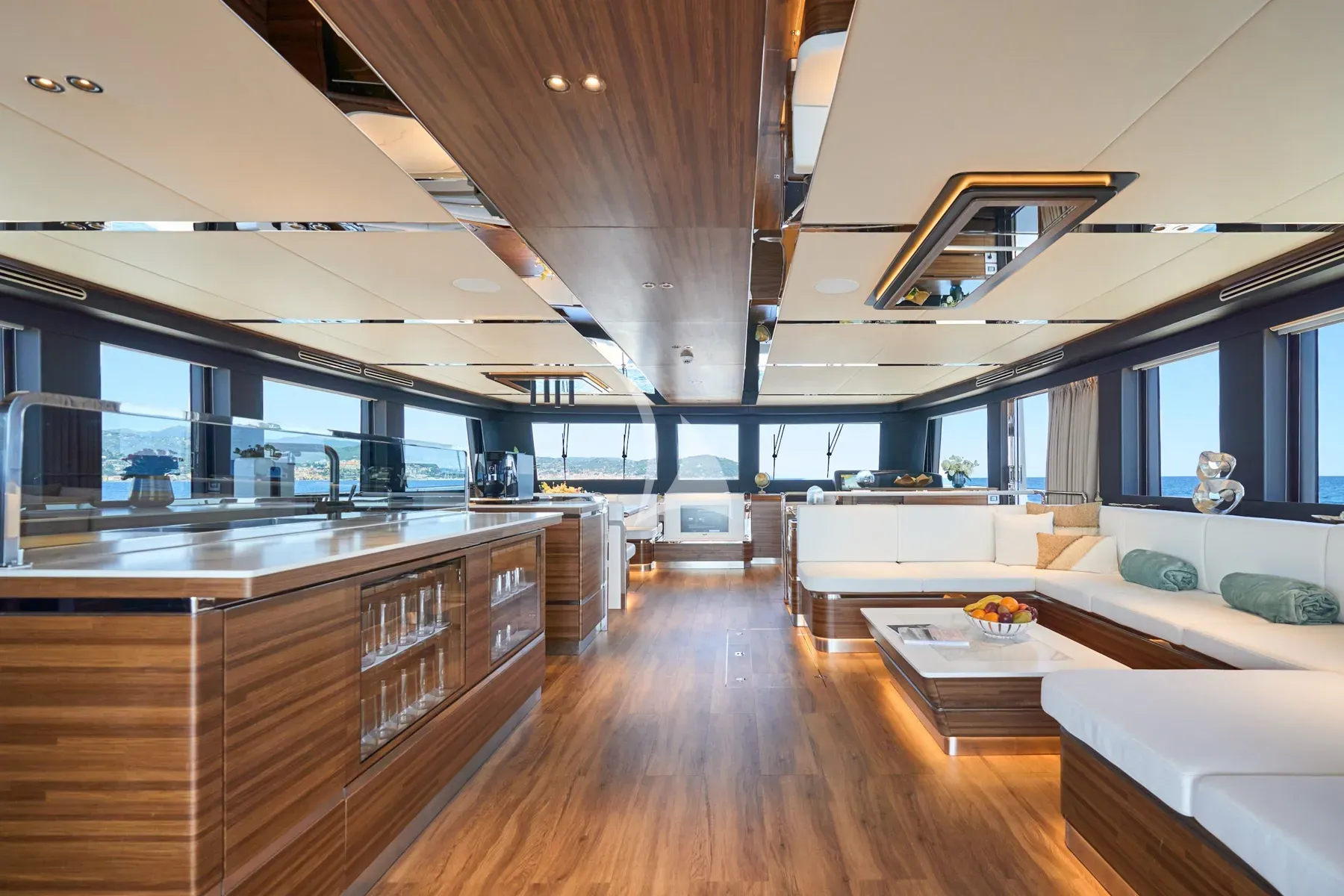 Be welcomed by her inviting aft deck, where an alfresco dining area awaits, perfect for savoring gourmet meals under a breathtaking sunset while anchored near the picturesque Port Grimaud. Start your mornings basking in the sun on her foredeck’s twin trampolines, gazing at the endless blue horizon. For a truly mesmerizing perspective, ascend to her elegant flybridge, where a plush bar and lounge provide an idyllic setting to sip on a glass of chilled Rosé while soaking in the panoramic views of Cannes.