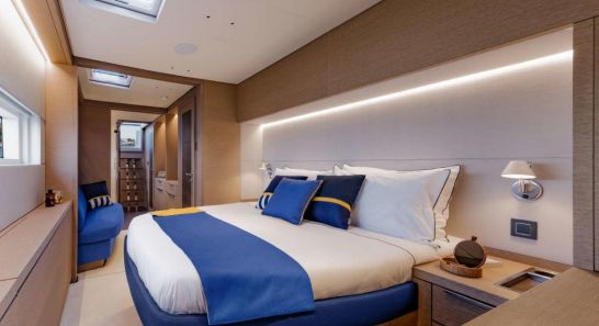 Inside, AURA feels airy and refined, with teak accents and modern furnishings that make the saloon both elegant and welcoming. Her cabin layout, featuring 4 doubles and 1 twin, ensures ample room and privacy for every guest, while the ensuite bathrooms add comfort after long days of exploration.