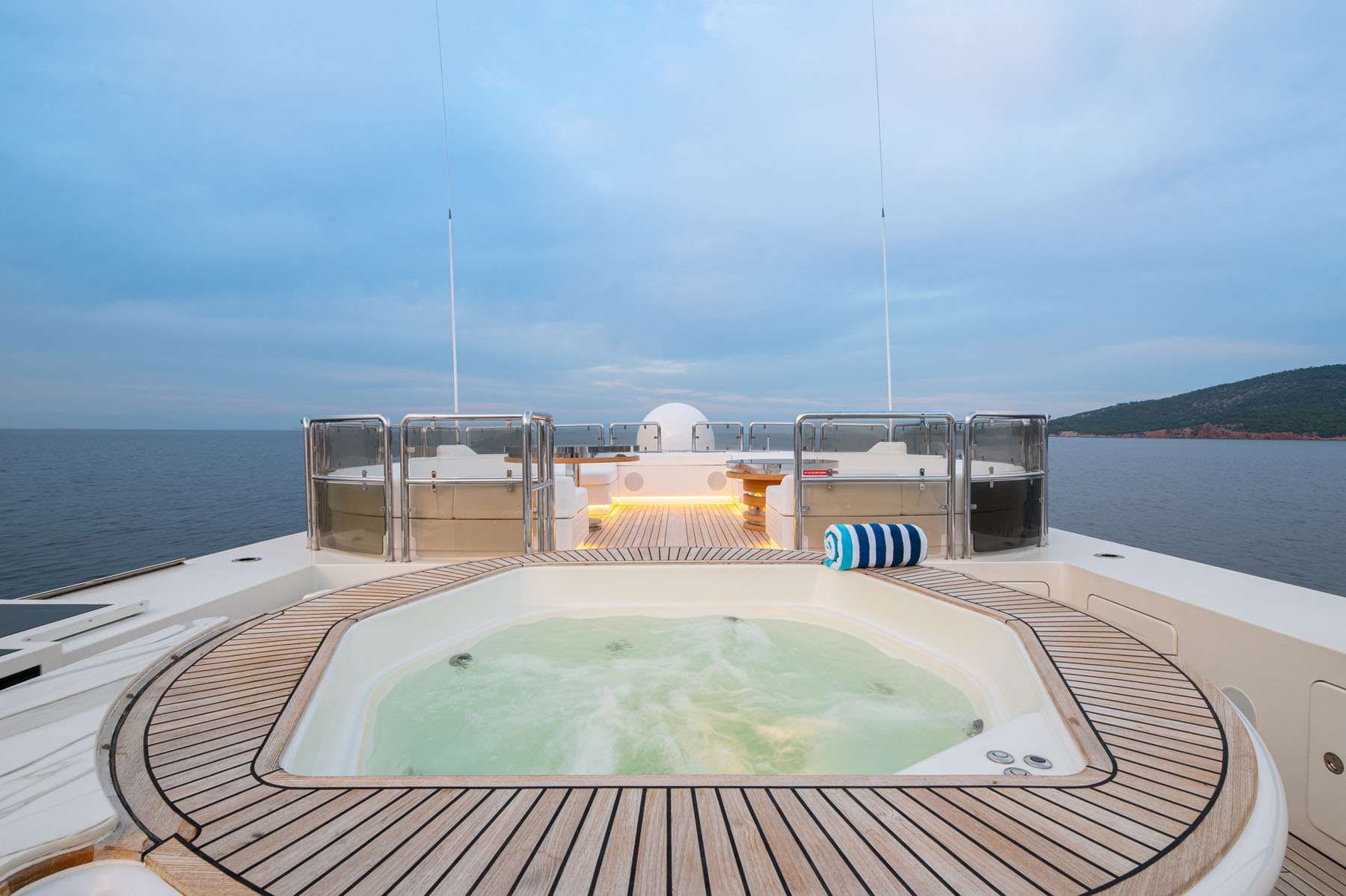 On the sun deck, panoramic views of Athens unfold like a living postcard as you share Ouzo and laughter with loved ones. As midday warmth sets in, retreat to the jacuzzi where the soothing bubbles and Aegean breezes carry you into a state of serenity while sipping a Mojito. Begin your mornings with a freshly prepared breakfast on the foredeck, basking in the glow of the Greek sun from cushioned loungers while the horizon stretches endlessly ahead. By evening, the sky deck aft transforms into a stage for alfresco dining against the ivory-white skyline of Mykonos, where vibrant island life beckons just beyond the quay.