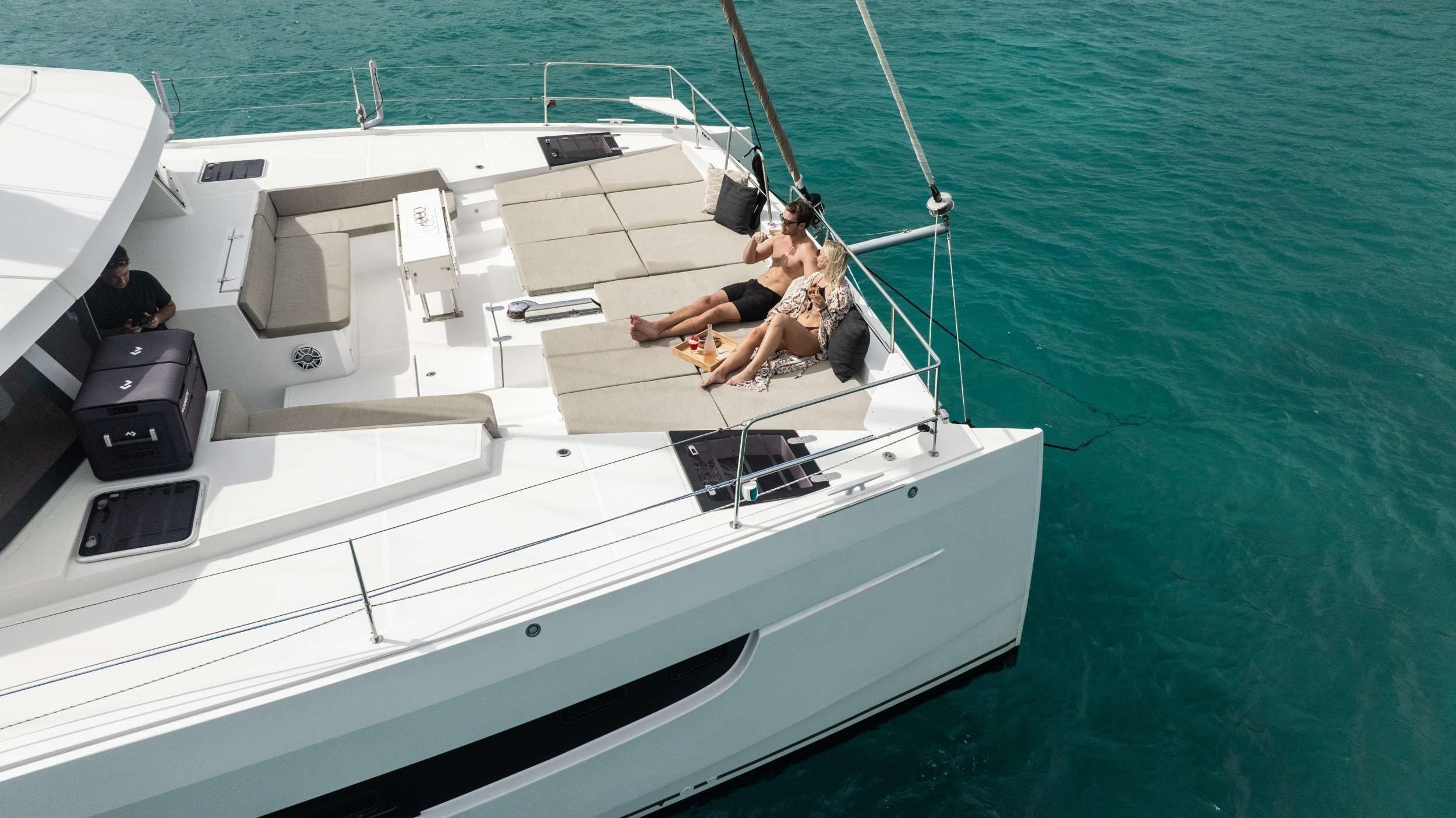 The open concept interior design enhances the sense of freedom, with the saloon and foredeck merging into one expansive living space. Wall panels open effortlessly to let the sea breeze drift through, or close when privacy is preferred. Four well-appointed queen cabins below deck each include a private en-suite, offering a quiet and comfortable retreat after days filled with sunshine and activity.