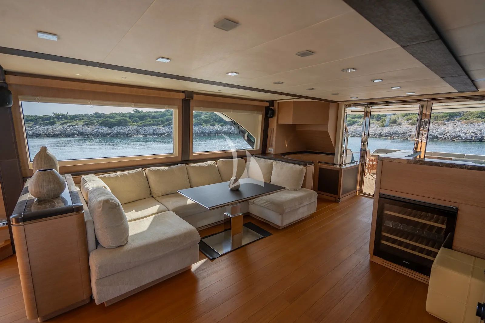Inside, the yacht reveals a warmer and more intimate side through an interior that combines contemporary and rustic design with ease. High-quality fabrics and linens add depth and softness to the space, making the atmosphere feel polished and welcoming at once. After time spent in the water and out on deck, the spacious cabins give guests the retreat they want, each equipped with a private bathroom and entertainment set for complete comfort. The master cabin, with its king bed, lounge, LED TV, and 5-star ensuite bathroom, feels especially inviting when the day finally slows.