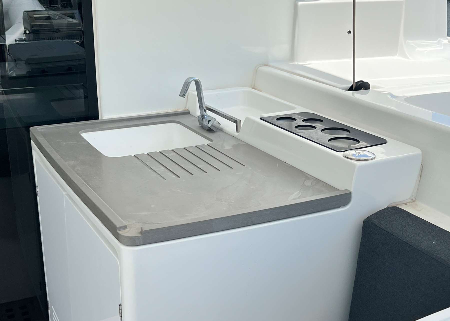 Step inside BIG BERTHA's bright, modern interior, where an open plan saloon welcomes you with panoramic windows, a relaxed lounge area, and a dining space connected to the galley. The atmosphere is airy, inviting, and perfectly suited for lively gatherings or quiet moments in cool air-conditioned comfort.