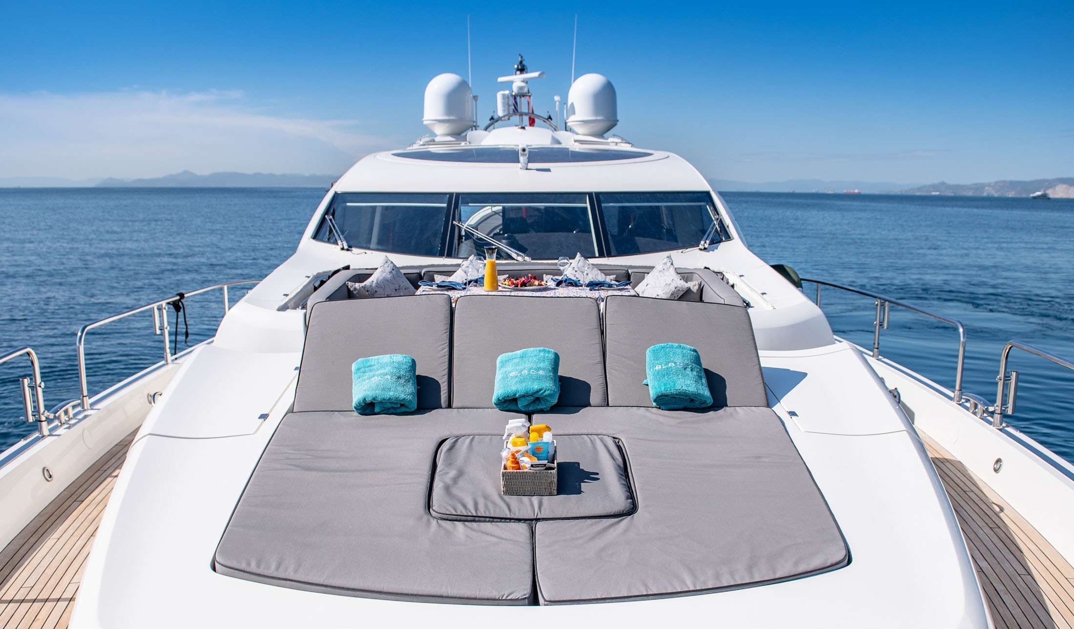 Start with the views from her mini flybridge in Athens, where the sunbathing pad becomes your front-row seat to ports, coastline, and ancient landmarks. Open a bottle of Ouzo, lean back, and let the conversation drift with the breeze as Greece unfolds around you. Later, arrive at the iconic waterfront of Mykonos, where ivory architecture lines the harbor like a postcard, then enjoy an alfresco feast on the aft deck before stepping ashore to soak up the island’s relaxed energy. Mornings can be just as memorable on the foredeck lounging area, with a tasty breakfast followed by unhurried sun time on cushioned sun beds, the open sea stretching ahead.
