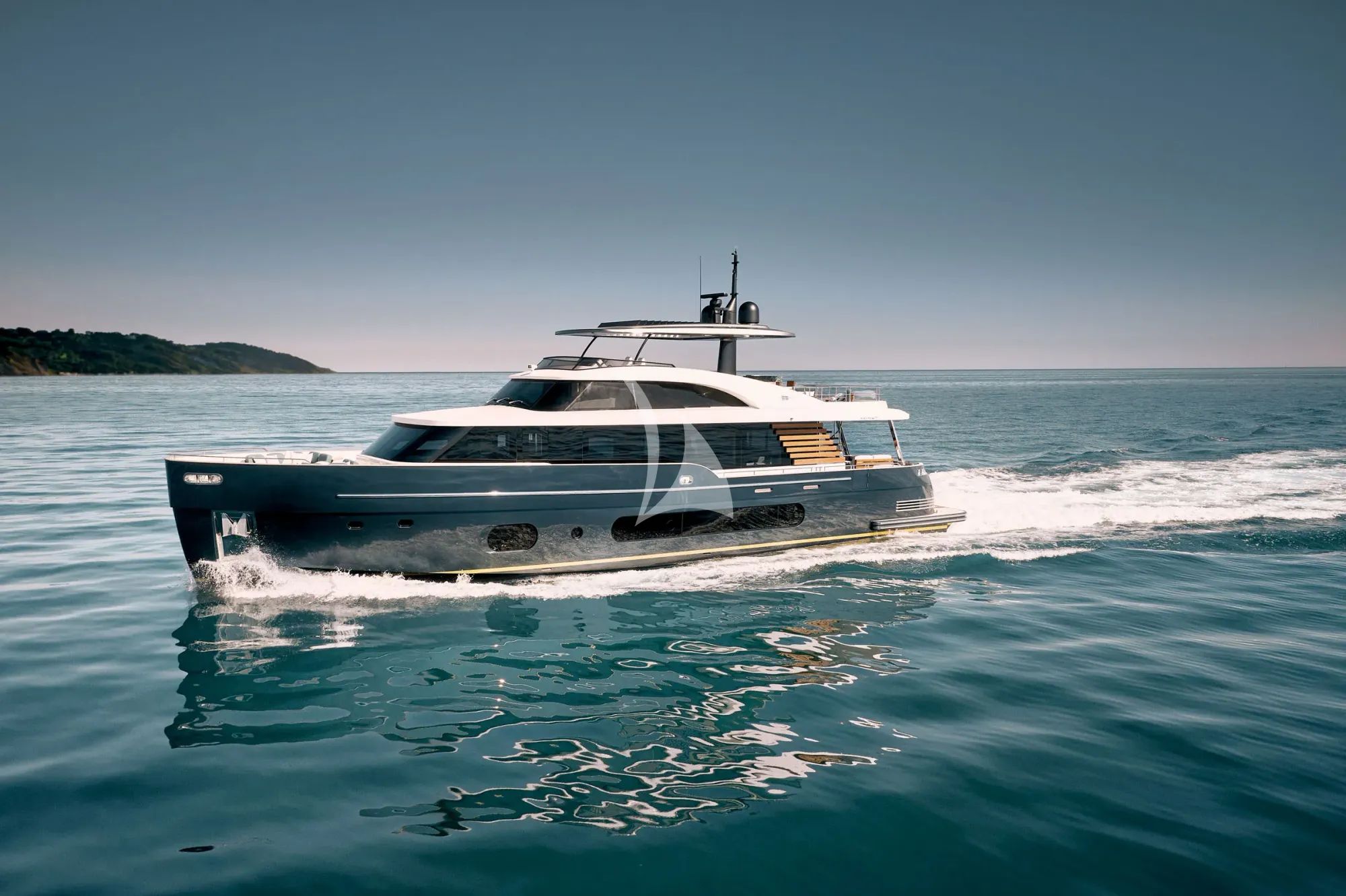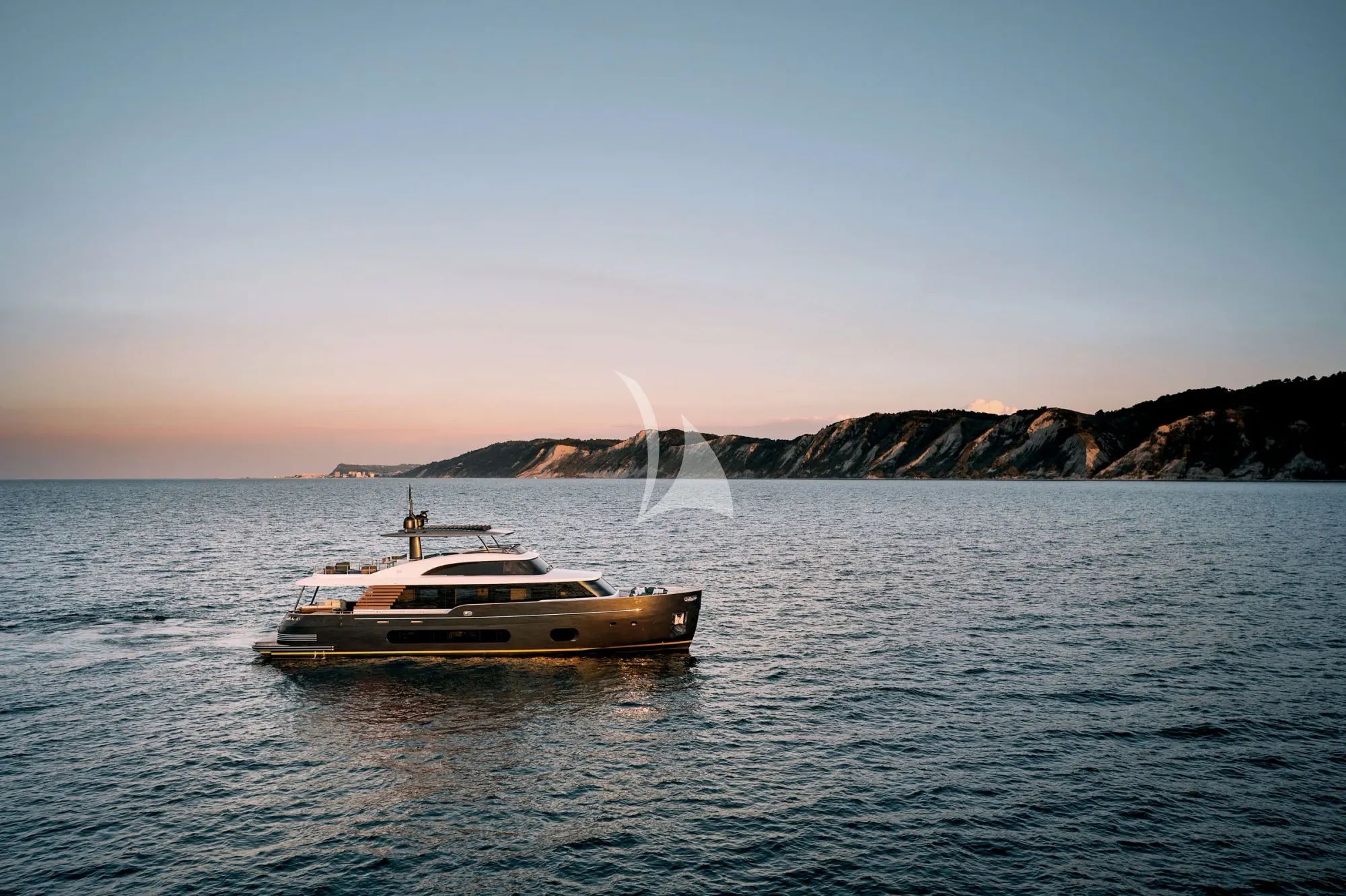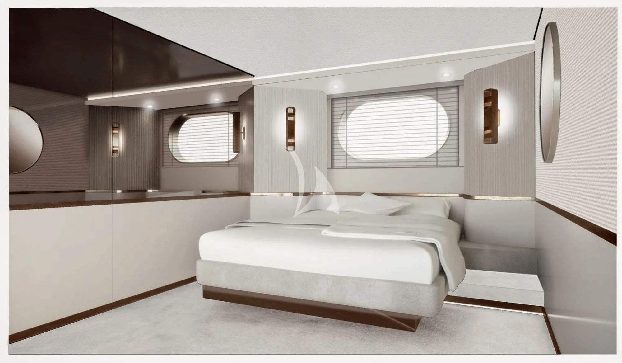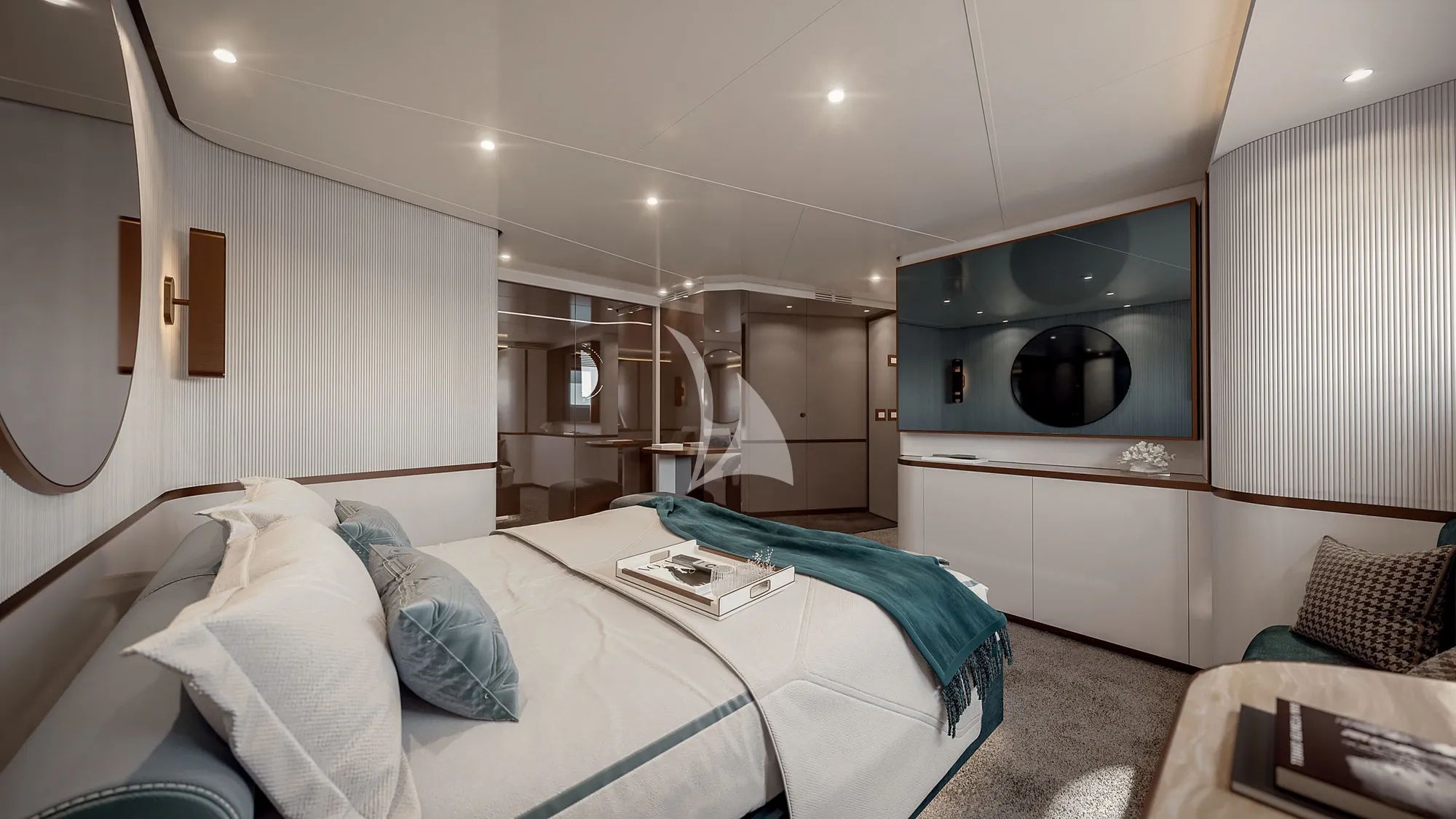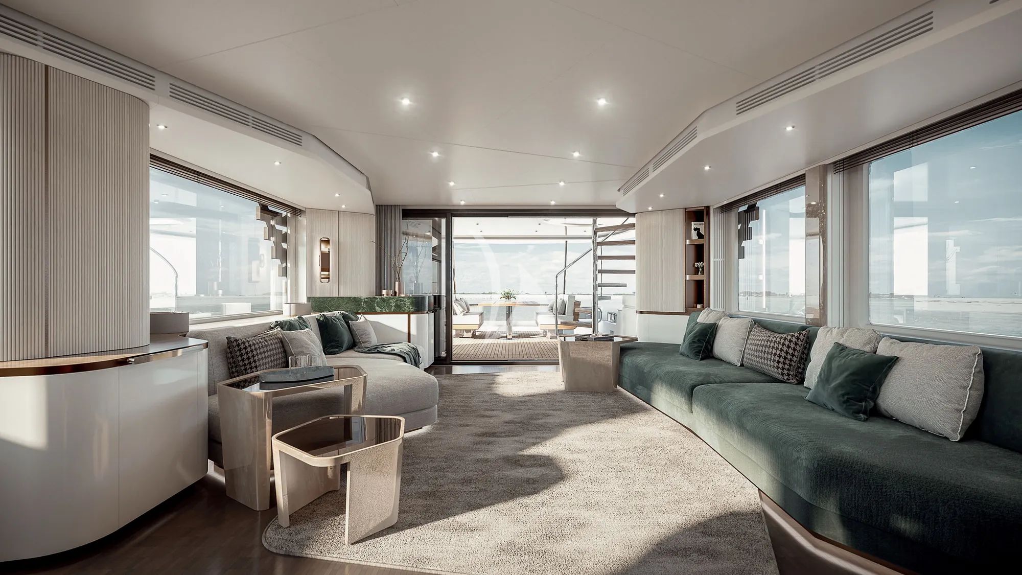 The interior welcomes you with a light, modern look, softened by marine tones and clean architectural lines that keep the mood calm and uncluttered. Panoramic windows surround the main deck, filling the living spaces with natural light and creating an airy sense of volume as the coast slides past. Materials and finishes are carefully selected to balance sophistication and durability, bringing comfort you can enjoy without fuss.