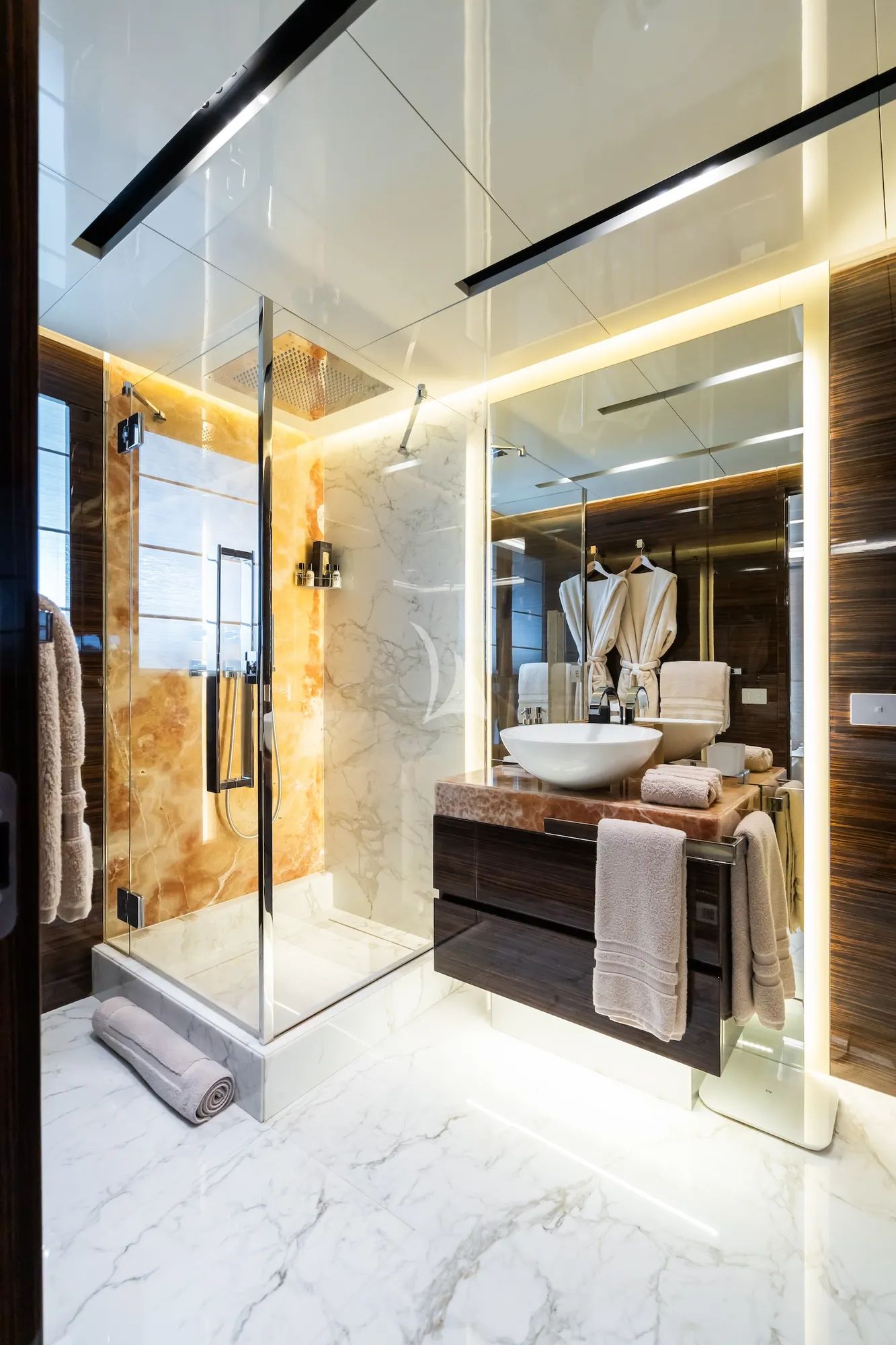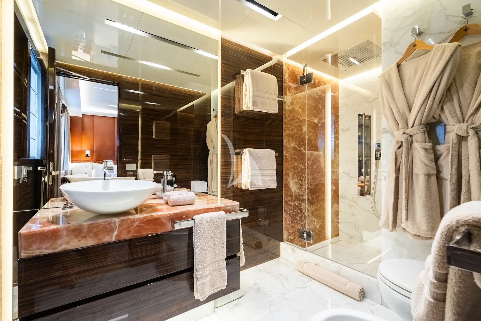 Stepping inside, you find that BLUE MOON’s interior design pairs modern and contemporary styling with the warmth of teak to create a refined yet inviting atmosphere. Large glass windows surround the saloon, formal dining area, and galley, bringing in generous amounts of natural light and keeping the French Riviera just beyond the glass. When the day winds down, the sumptuous cabins stand ready with private en-suites, offering each guest a quiet retreat. The master cabin takes this experience further with a king bed, relaxing lounge, walk-in closet, marble en-suite bathroom, and a retractable balcony that turns sea views into a private, open-air sanctuary.