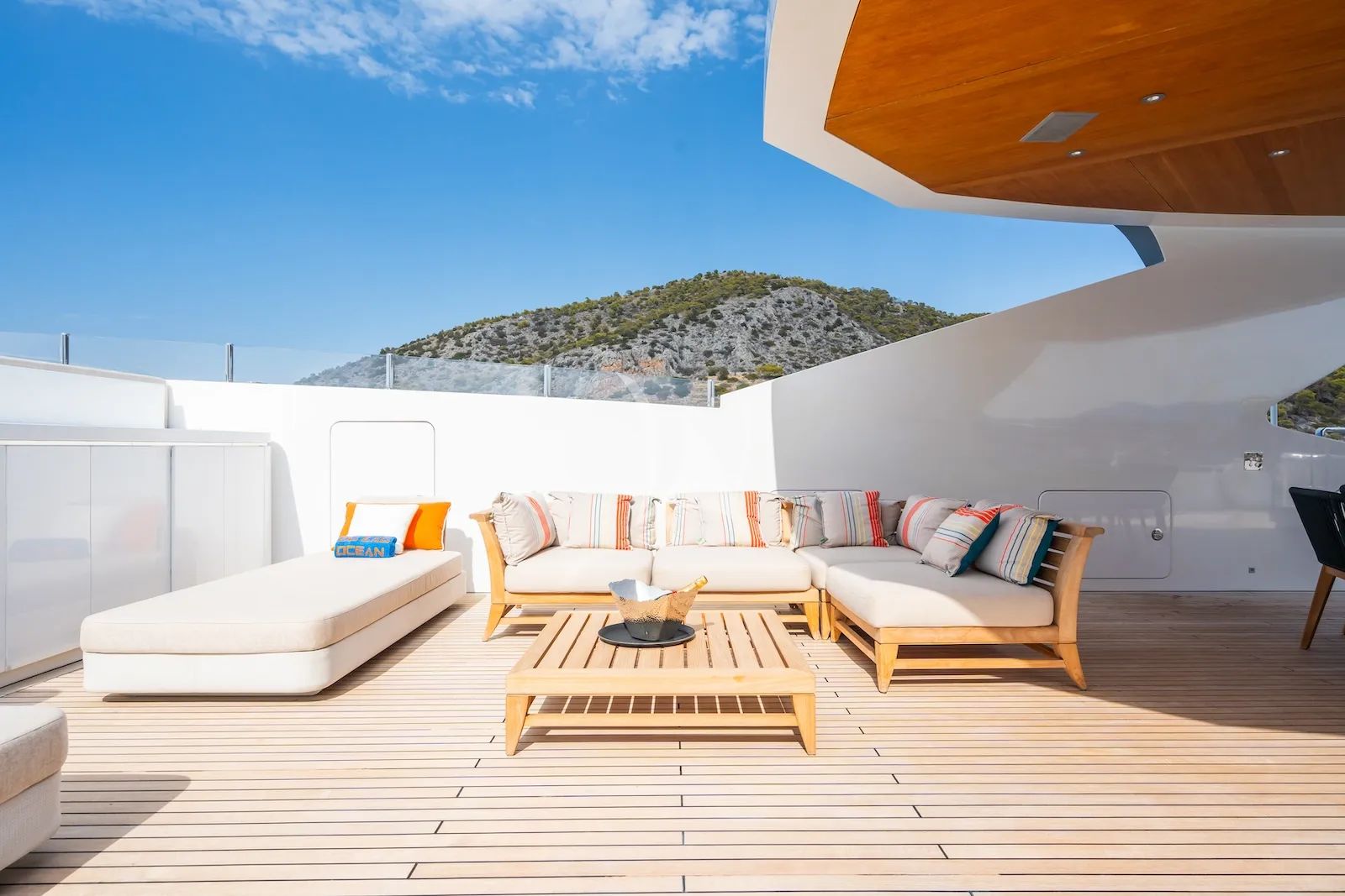 As the first light brushes the horizon, the spacious foredeck sunbathing area becomes your personal viewing platform, where you can stretch out and watch the sea awaken. When it is time to rejoin the hum of the coast, the expansive sundeck offers a commanding vantage point over Cannes, with the town’s iconic charm spread out in front of you. Soft seating in the lounging and dining area invites long conversations over a fine bottle of Bordeaux as yachts glide in and out of the harbor. Multiple sunbathing options throughout the yacht mean you can always find your perfect spot, and the jacuzzi provides a cool escape from the sun, especially when enjoyed with a refreshing Mojito.