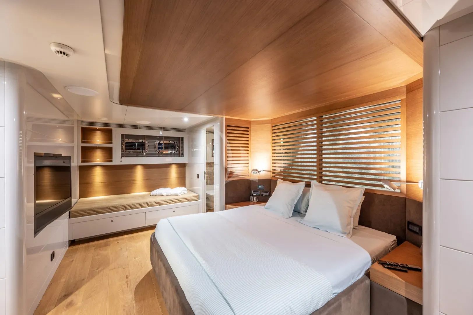 Stepping inside reveals an interior that is both polished and inviting, where contemporary style is softened by thoughtful finishes and a calm palette. Expansive windows frame the views on both sides of the main saloon, indoor dining space, and fully-equipped galley, allowing natural light to pour through and keep the sea close by even when you are indoors. After the buzz of the day, your cabin becomes a peaceful retreat, with generous space and a luxurious private ensuite bathroom that encourages you to slow your pace before bed, then wake up ready for the next stretch of your Mediterranean adventure.