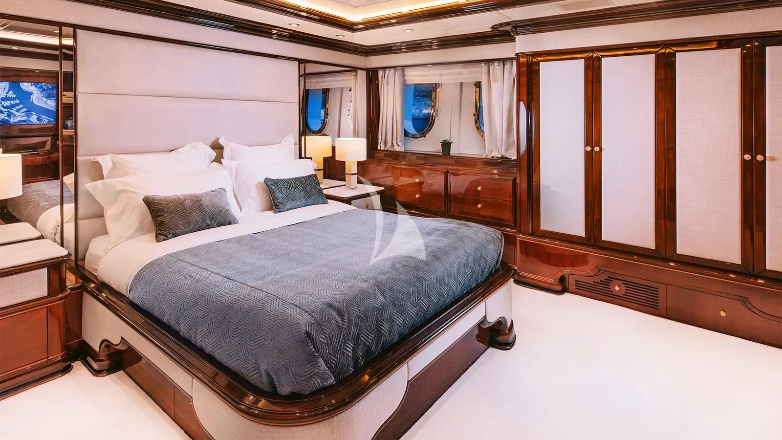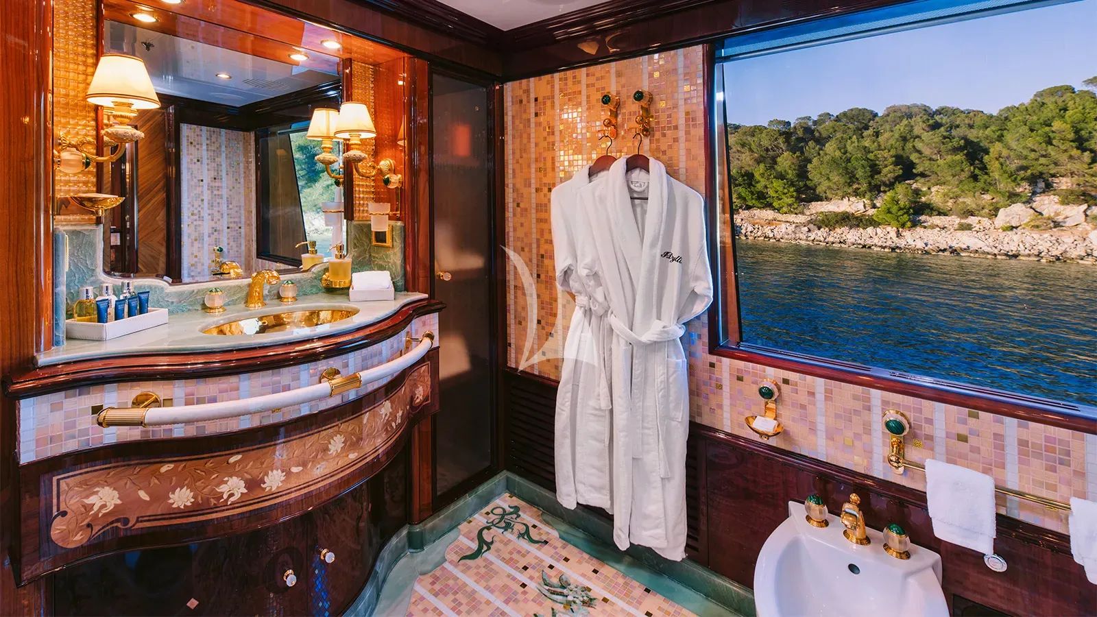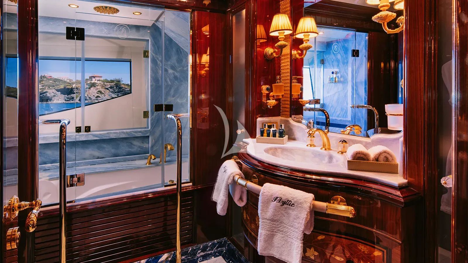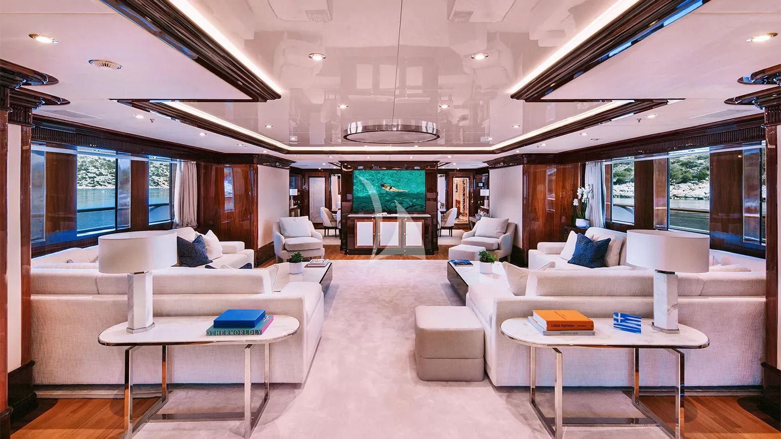 As you move inside, DILARA’s spacious interior unfolds in a series of beautifully curated rooms that showcase modern and contemporary Italian styling. Large glass windows frame the views and draw sunlight deep into the yacht, creating a bright, uplifting ambiance that follows you throughout your journey. In the main saloon, a comfortable lounge flows into a generous dining area, highlighted by shimmering glass fixtures that subtly elevate dinners and celebrations. When the evening calls for music and a change of mood, the sky deck saloon becomes your social hub, with another lounge and bar area that feels tailor-made for after-parties and late-night gatherings. Moving between decks is effortless thanks to the elevator, which adds a layer of comfort and convenience that you will quickly come to appreciate.