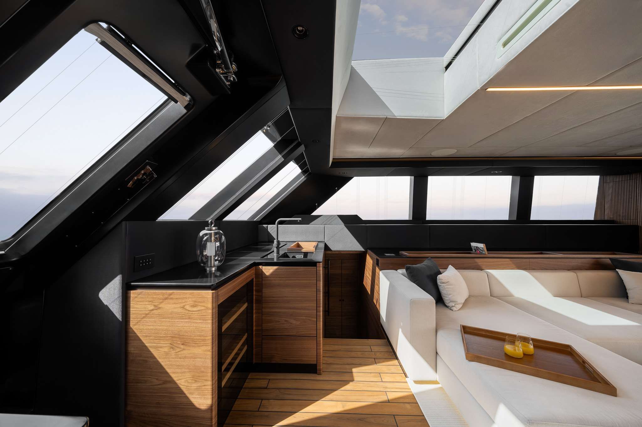 As the afternoon slips into evening, the yacht takes on an entirely different mood. The aft deck becomes a refined setting for a seafood dinner prepared and served by your attentive crew, with the coast glowing more softly as daylight begins to fade. Up above, the flybridge offers one of the best perspectives on Porto Cervo, where marina life, stylish waterfront scenes, and an unmistakable social buzz bring contrast to the quieter anchorages of earlier in the day. It is a wonderful place to share drinks, settle into conversation, and watch Sardinia shift from sunlit beauty to evening sophistication.