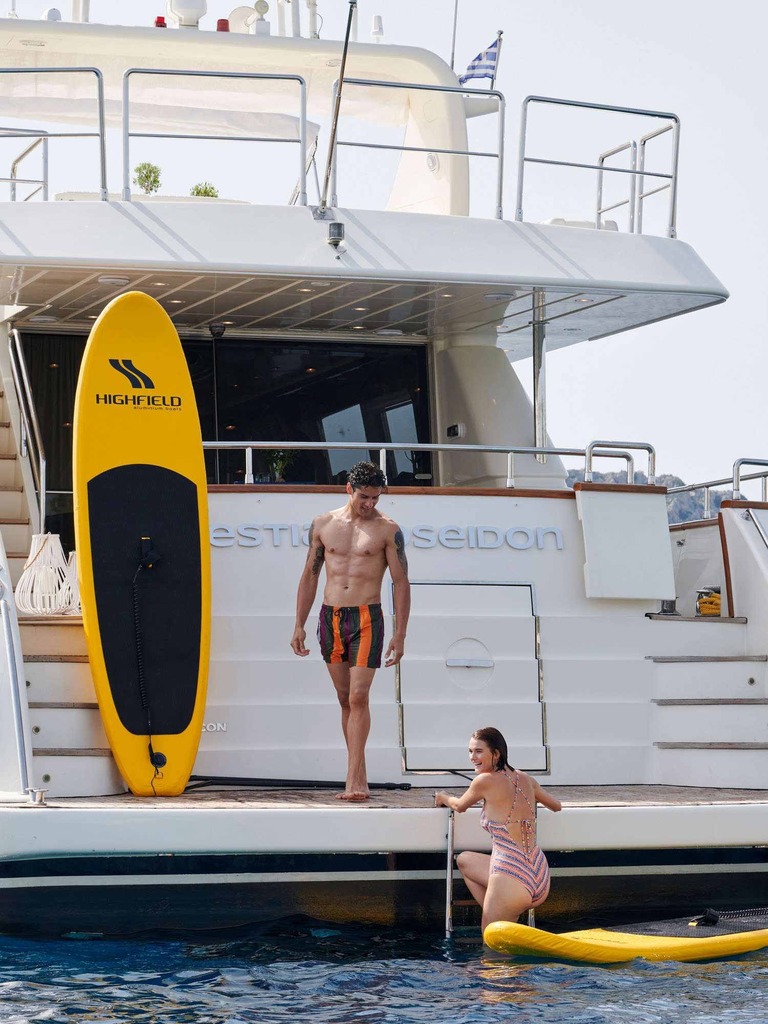 No crowded station, just island celebration, the Cyclades hit different aboard the Falcon 86 luxury crewed motor yacht ESTIA POSEIDON, paired with the relaxing comfort of her 4 cabins perfect for 10 guests.Your Charter Crew: