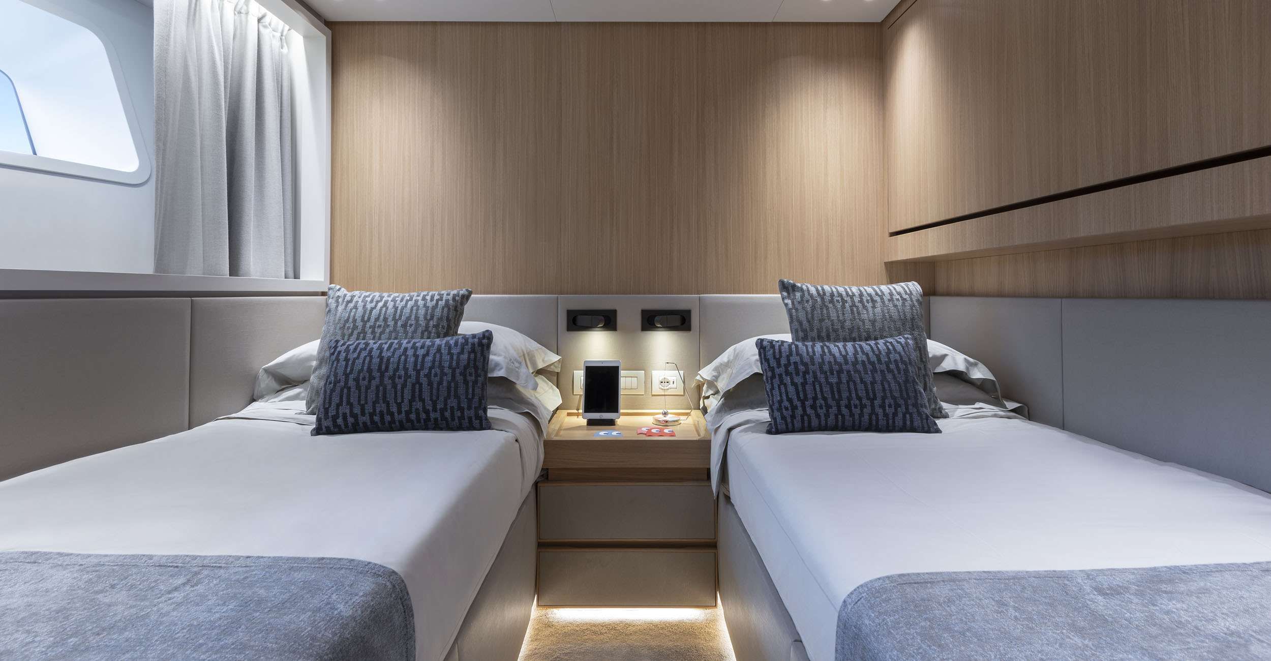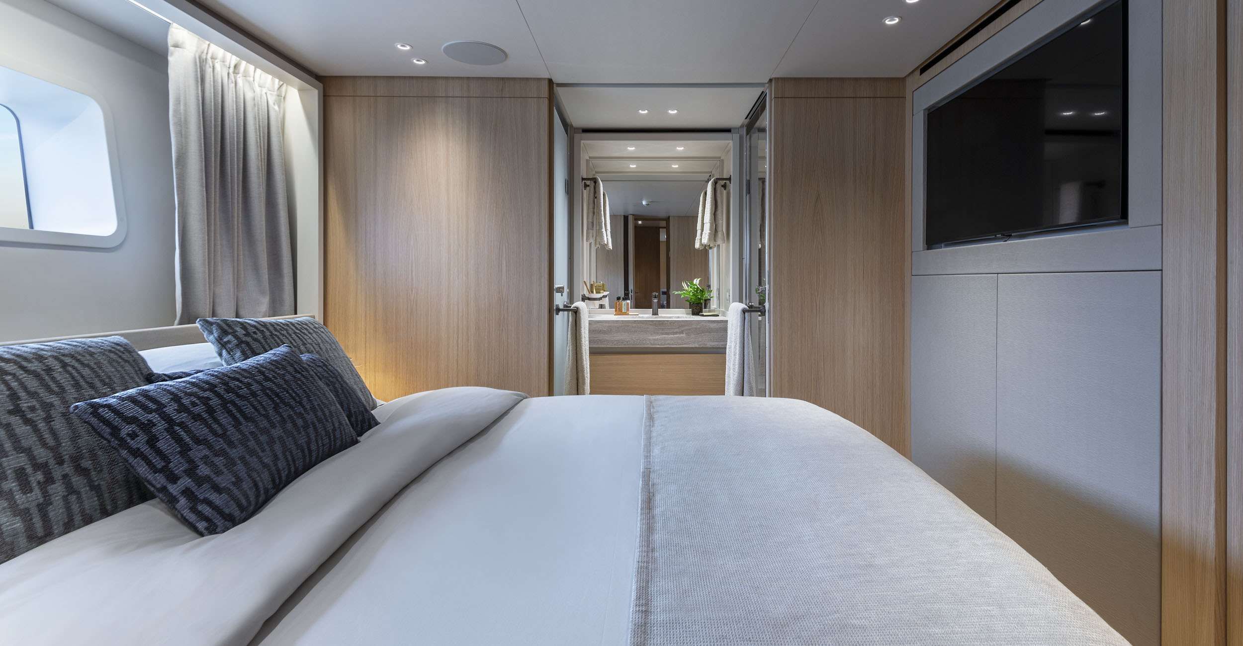 Inside, the saloon introduces a warm and inviting atmosphere shaped by refined materials and a carefully considered layout. Contemporary sofas create a comfortable space for relaxing together, while the adjacent dining table anchors the interior with a sense of understated elegance. The master suite on the main deck feels generous and calm, featuring a king bed, the largest LED TV onboard, and a modern ensuite bathroom designed for everyday comfort. Two VIP staterooms and two twin cabins on the lower deck, one with a pullman bed, continue the same thoughtful approach, creating private spaces that feel restful, cohesive, and quietly reassuring.