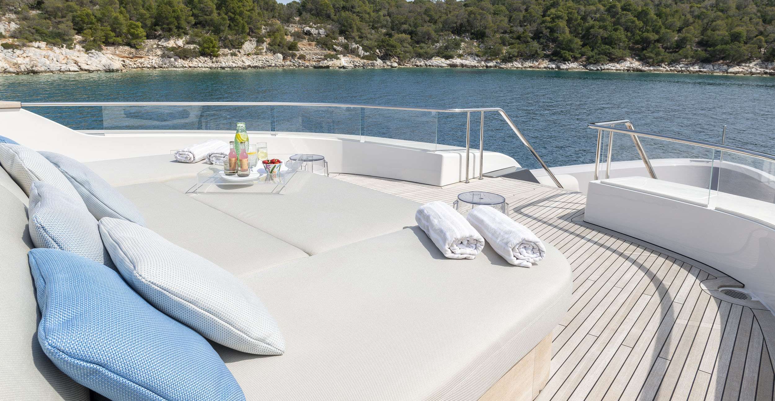 Outdoor living becomes a central part of daily life, beginning at the foredeck where expansive sunbathing areas and modern sofas invite slow mornings and sun-filled afternoons. From this forward-facing vantage point, the sea feels close and ever-present, creating a natural rhythm for relaxation. Above, the secluded sun pads offer a quieter refuge, ideal for reading, resting, or enjoying uninterrupted views. At water level, the swimming platform opens directly onto the clear Greek waters, serving as both a launch point for water toys and an easy-access space for swimming and lingering by the sea.