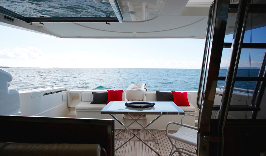 This is a great choice for a charter around the Greek Islands. She is a Ferretti 53. She can accommodate up to 10 guests for day charters.Her flybridge adds to the boat by allowing a more generous exterior space and a better luxury yacht experience.
