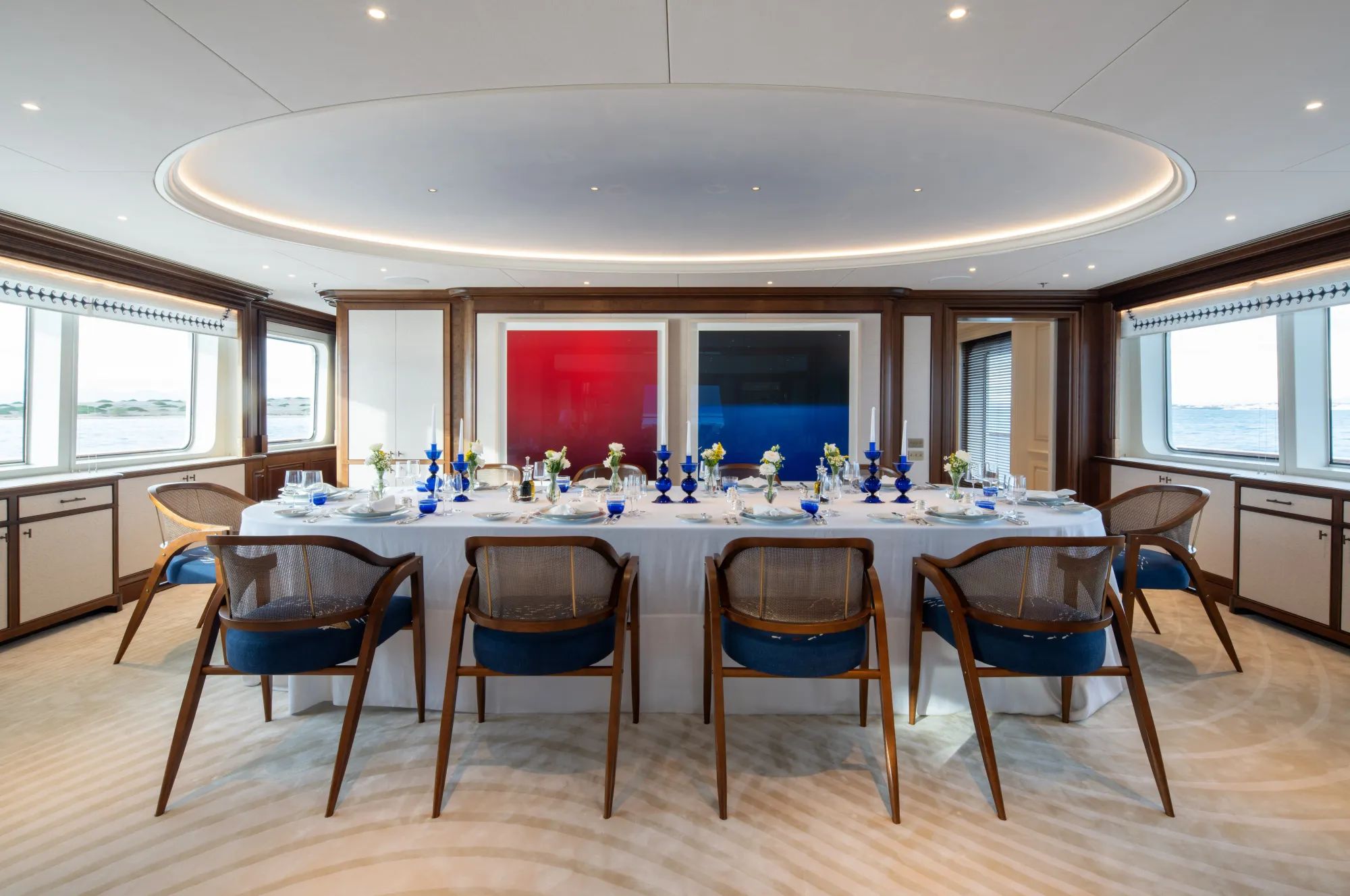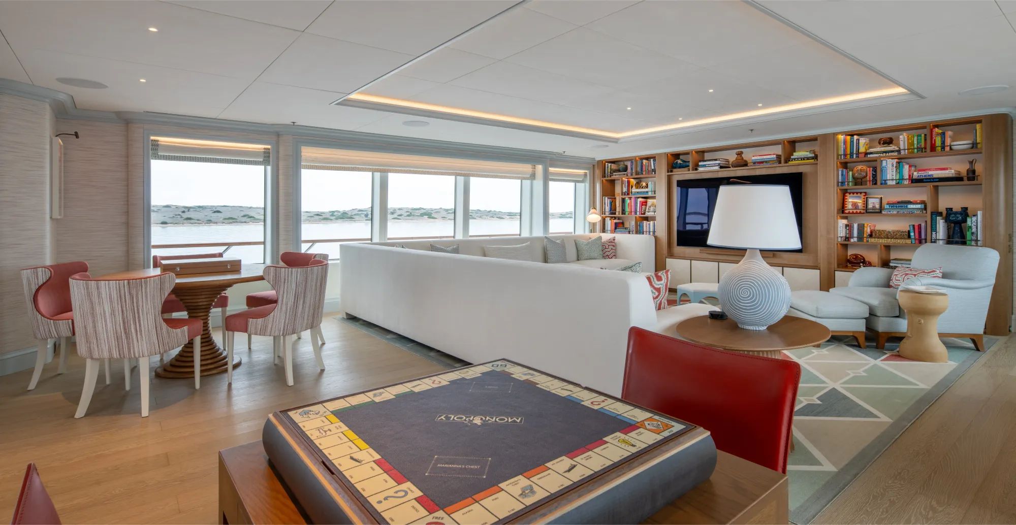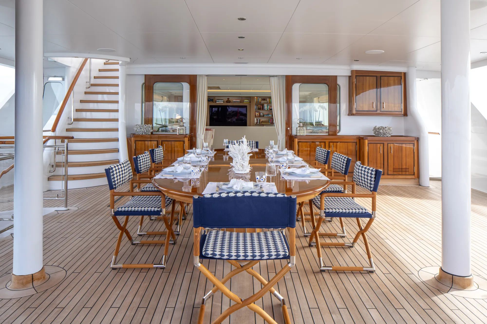 Inside FOS, the atmosphere is bright and refined, blending modern and contemporary designs in a way that feels welcoming, not formal. Glass windows surround the interior facilities, pouring natural light into every space and keeping the mood radiant, from the main saloon’s lounge, bar, and dining area to the sky deck’s TV lounge and game table, a perfect venue for quieter celebrations. An elevator makes it seamless to move across decks, while the spiral Disney Princess-like staircase offers a playful alternative when you want to take your time and enjoy the setting.