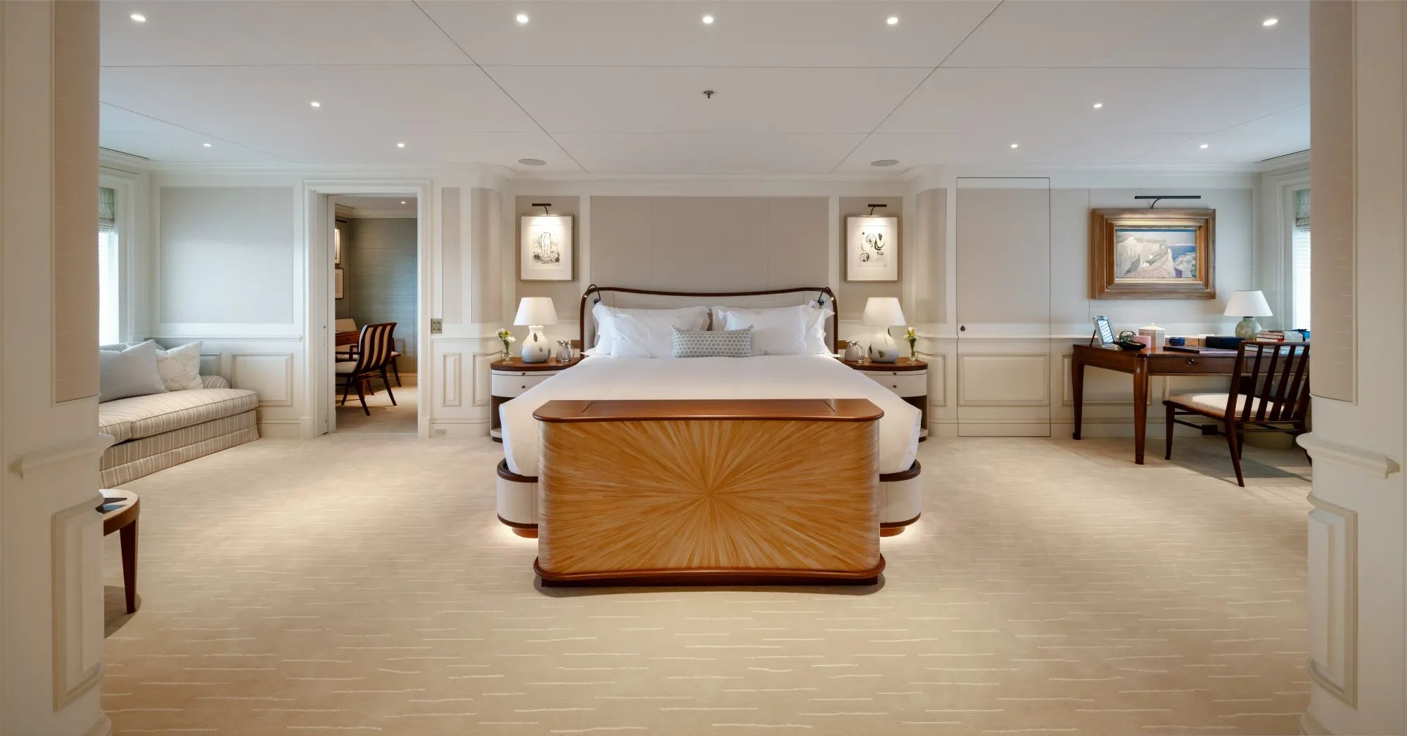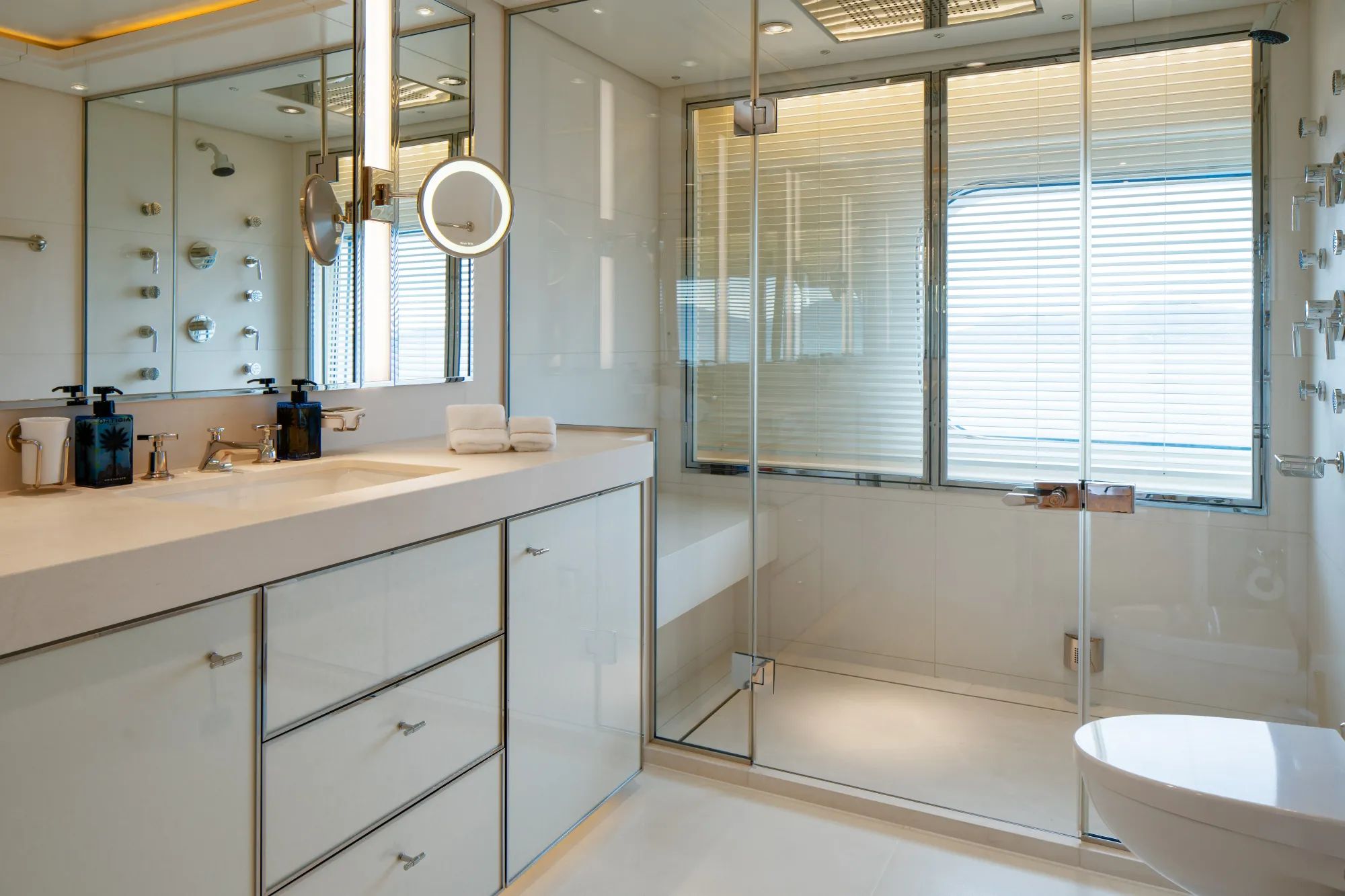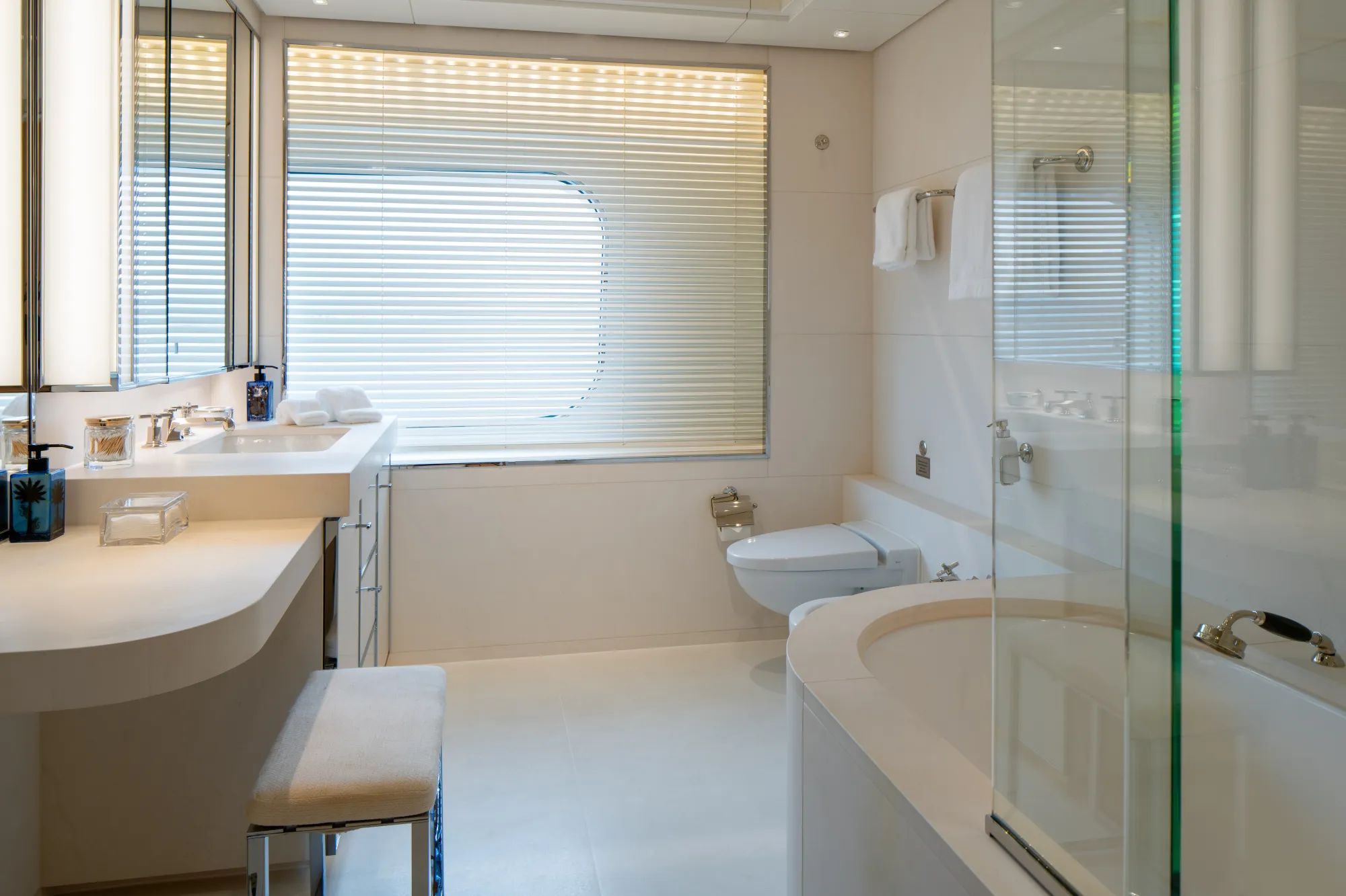 When the day winds down, your cabin becomes your reset button. FOS offers 7 premium cabins, 5 kings and 2 queens, all with private bathrooms, giving everyone optimum comfort for 8 days or longer of island-hopping. The full-beam master cabin feels like a royal chamber with its huge bed, mini desk and lounge, dedicated office lounge, walk-in closet, and marble-white bathroom with its own bathtub. Then it is back out again on FOS’ tenders to discover hidden coves and charming islands, because the Cyclades keep rewarding you, whether you are chasing water sports, ancient ruins, or the next unforgettable bite ashore.