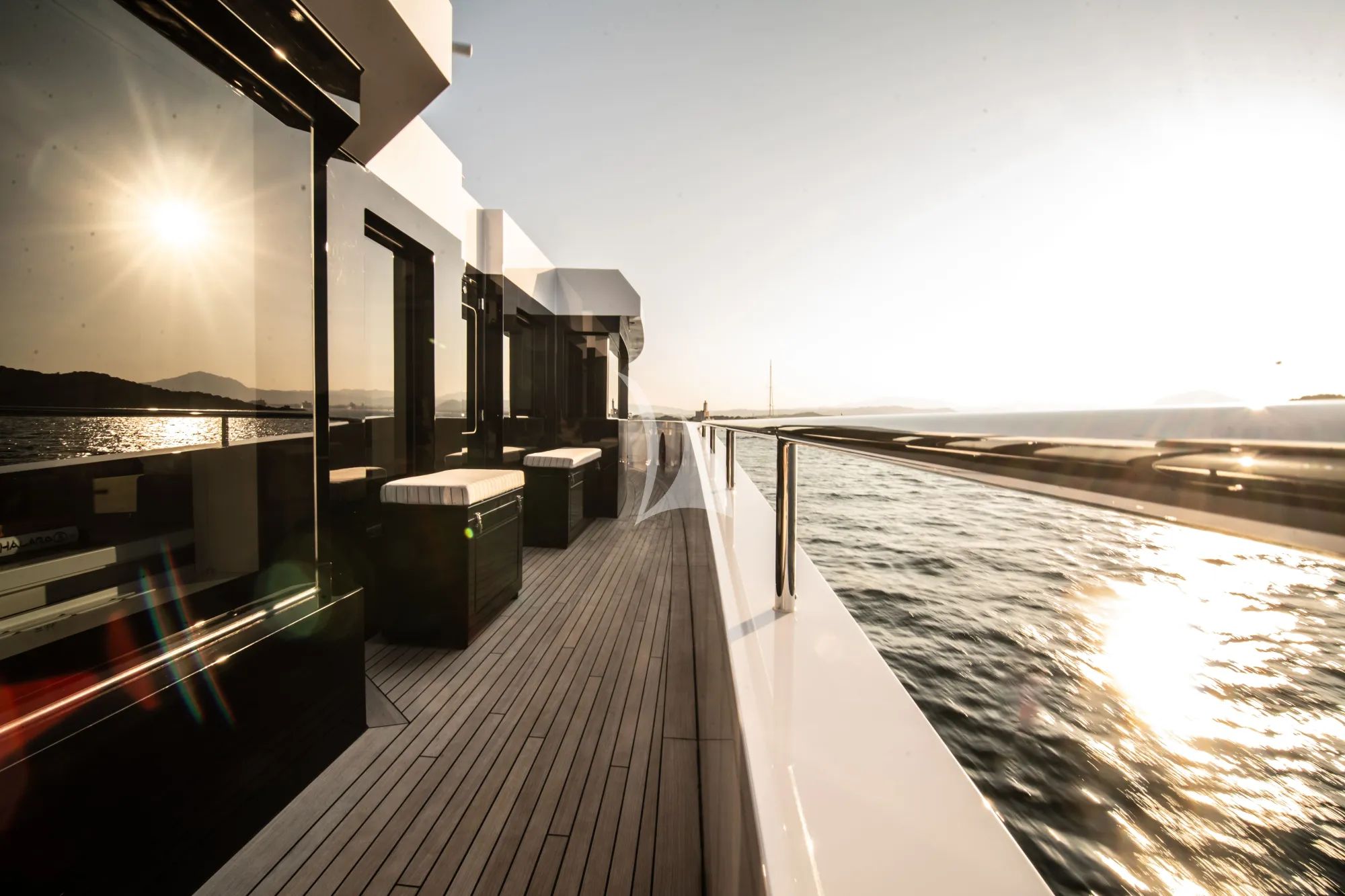 FOX’s exterior showcases a muscular, explorer-inspired silhouette and highly adaptable spaces, highlighted by a vast 103.5 sqm main deck aft that can accommodate an extraordinary array of water toys and equipment, launched with powerful deck cranes, a rare feature for a yacht of this size. This sprawling aft deck transforms into a lively social scene, complete with a DJ booth, alfresco dining area, and a sleek bar, all easily shaded by optional awnings for all-day comfort. The glass-enclosed sky lounge transitions effortlessly onto a spacious terrace, featuring a barbecue, outdoor dining setup, and panoramic sea views, ideal for both intimate meals and festive gatherings. Walkaround sidedecks lead you forward to a welcoming lounge just in front of the bridge, providing even more options for unwinding and enjoying the Riviera’s ever-changing scenery. As the sun sets, your attentive crew will set up an alfresco dinner on the sky deck aft, where you’ll savor exquisite local cuisine with the vibrant backdrop of Port Grimaud.