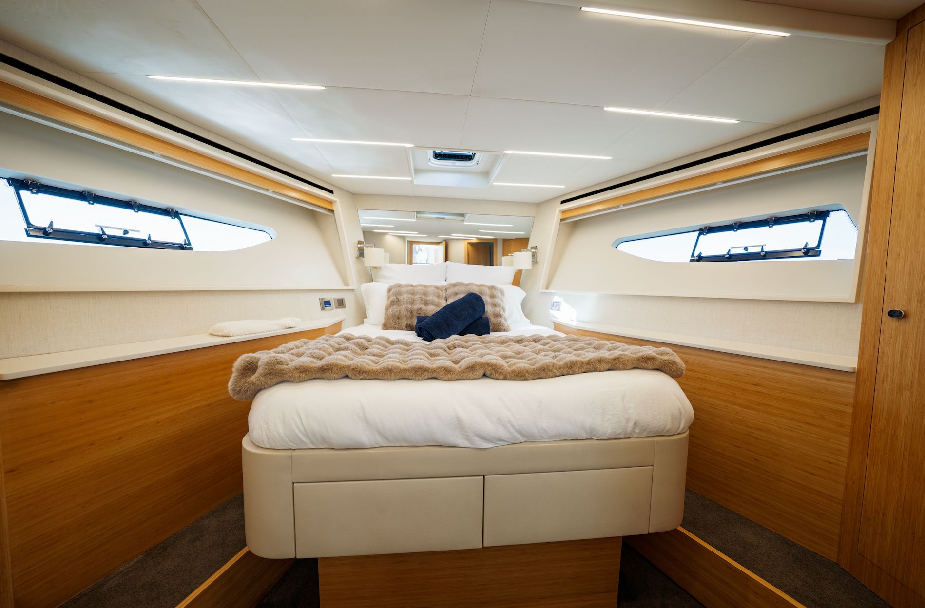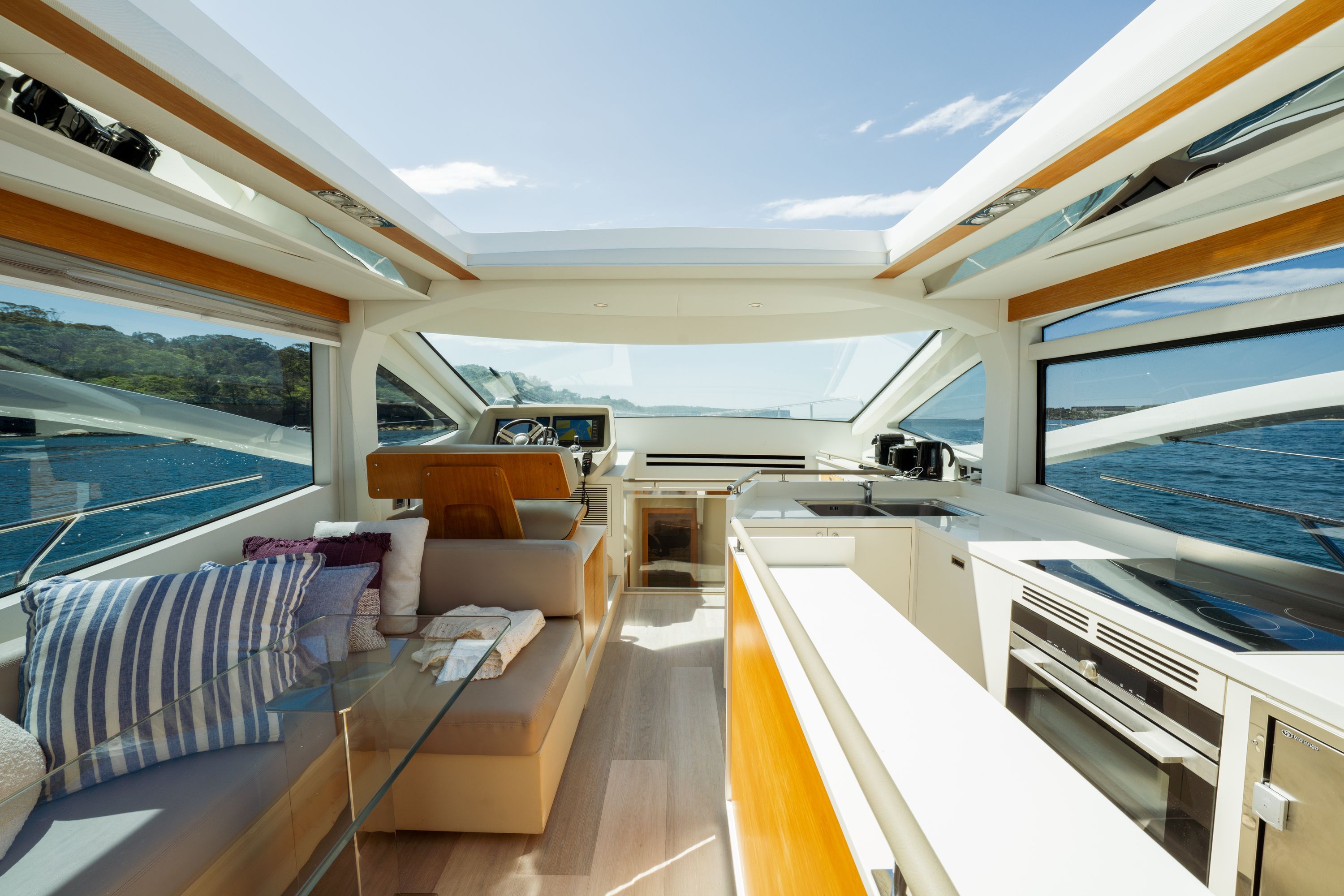 Step indoors to find a beautifully appointed interior that combines modern design with warm, inviting accents. The teak details give each space an elevated feel, while the wide windows let the outdoors illuminate the entire saloon. When evening comes, the well-appointed cabins with ensuite facilities offer a quiet haven for rest after a day of sun, sea, and discovery.