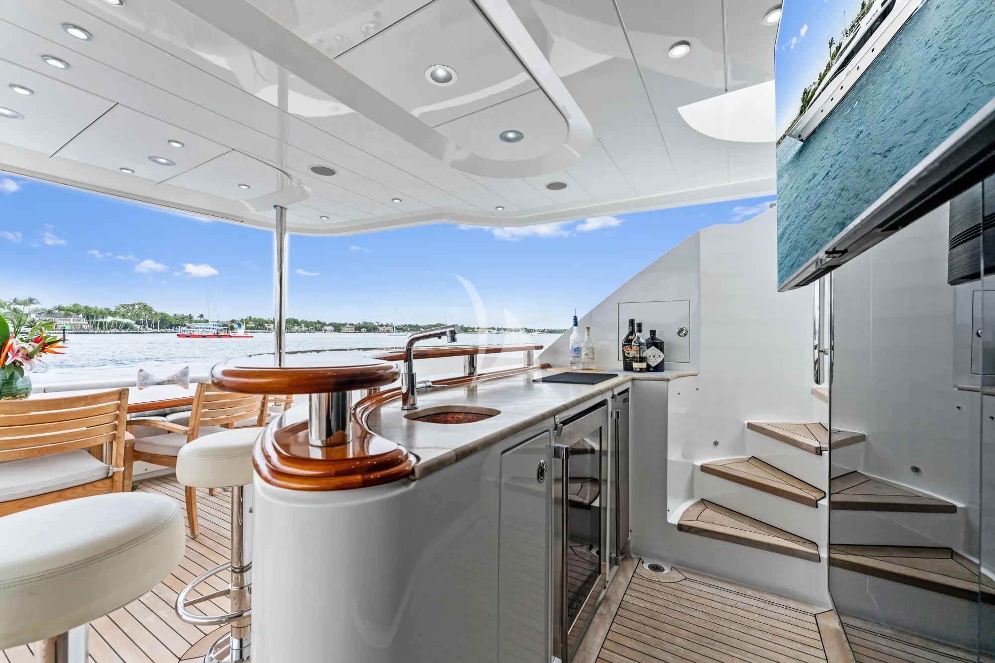 Life outdoors is where INVICTUS shines. Her expansive sundeck offers panoramic views of the Exumas, complete with a Jacuzzi, sun loungers, BBQ, wet bar, and shaded areas for long afternoons of relaxation. The aft deck provides a welcoming setting for alfresco dining, while the foredeck lounge becomes a peaceful retreat to start the day with coffee or unwind under the stars. Every exterior space has been designed to capture the beauty of the islands and create memorable moments at sea.