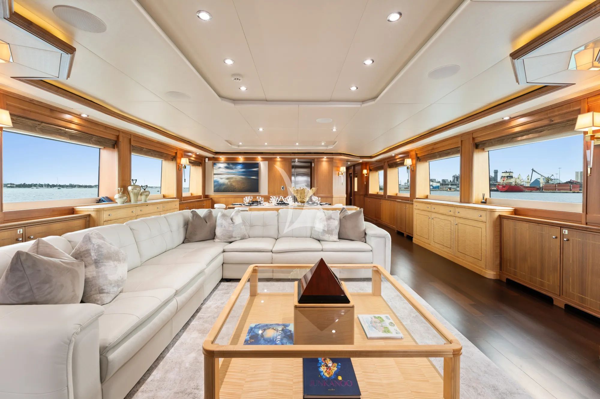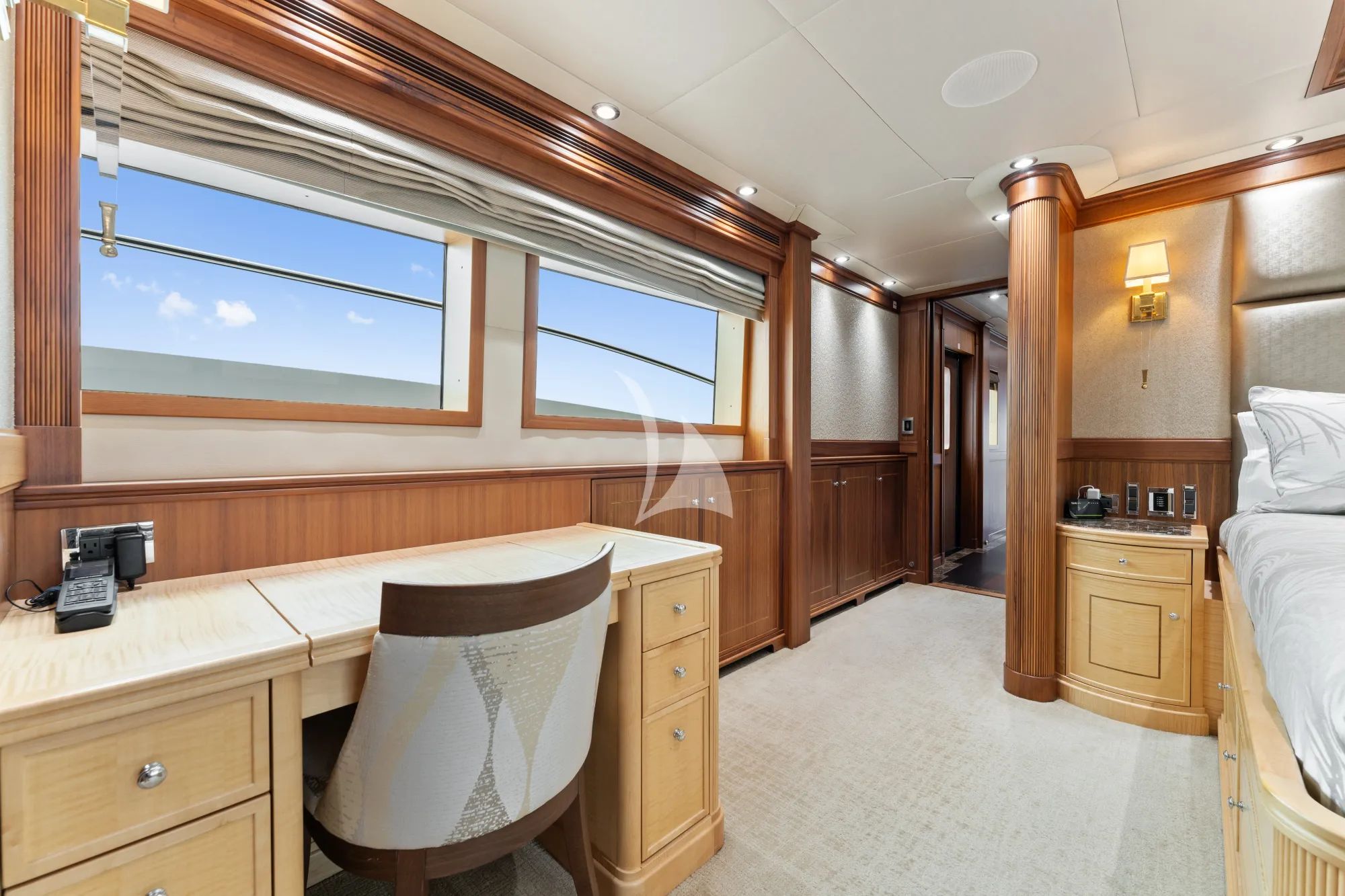 Step inside to discover interiors bathed in natural light from expansive windows. The saloon flows seamlessly into a formal dining space for eight, ideal for celebratory dinners or intimate evenings with friends. Guests can relax in plush seating while enjoying the state-of-the-art entertainment system or cocktails prepared by the attentive crew. This open, airy layout ensures every gathering feels both sophisticated and welcoming.
