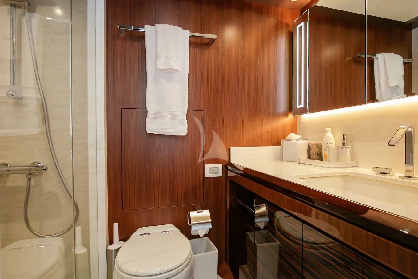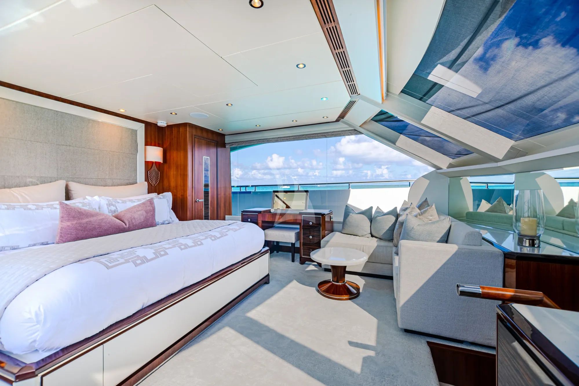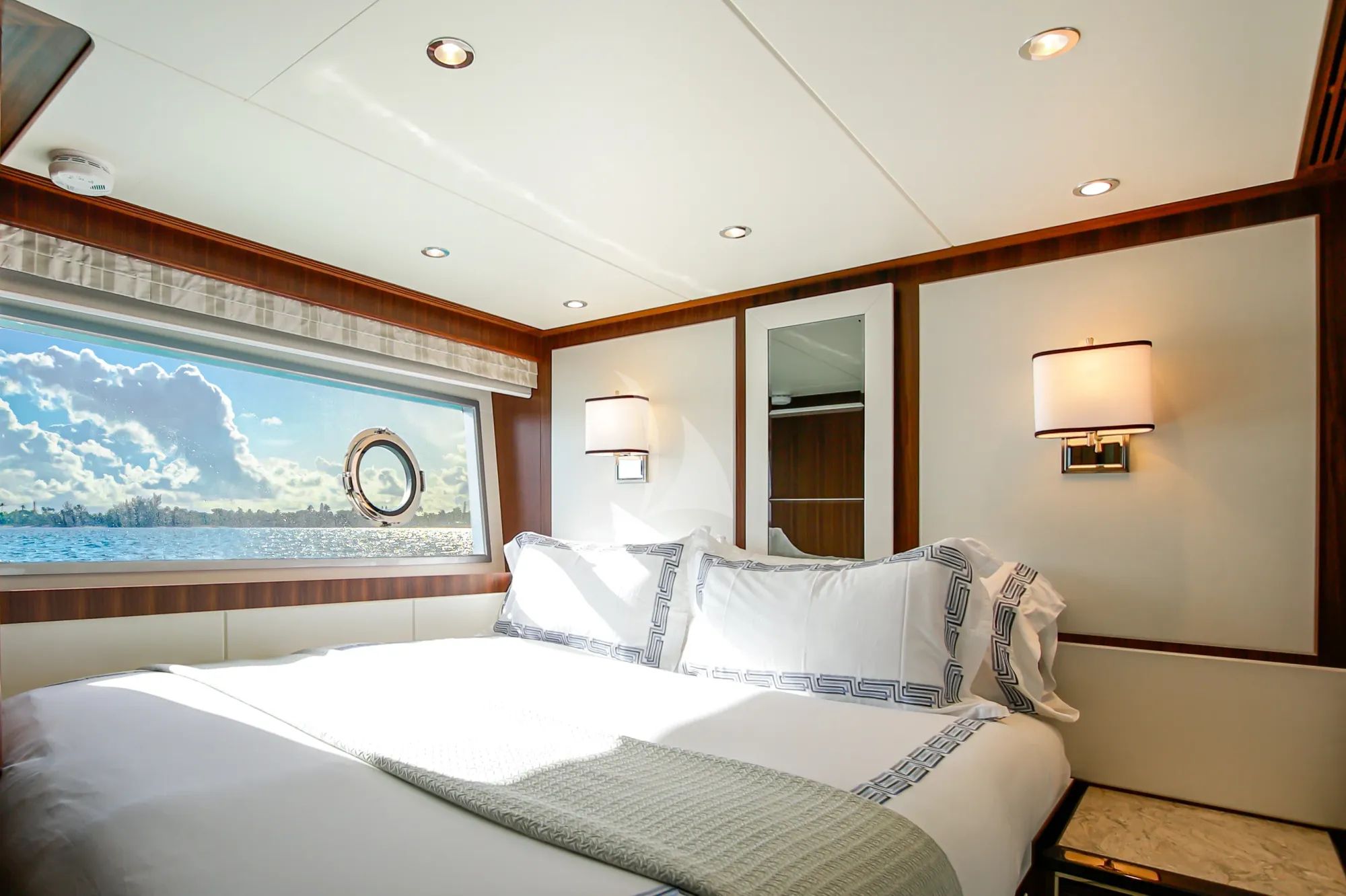 Inside, ISLAND COWBOY reveals an interior that feels bright, welcoming, and designed for gathering. The saloon and indoor dining area create a natural setting for onboard celebrations, framed by elegant finishes and generous light. Cabins with private bathrooms offer privacy and comfort, styled with teak accents and gray fabrics that bring a calm, residential feel. The master cabin stands out with its king bed, long couch, panoramic glass window, and marble ensuite, creating a refined retreat for downtime and rest.
