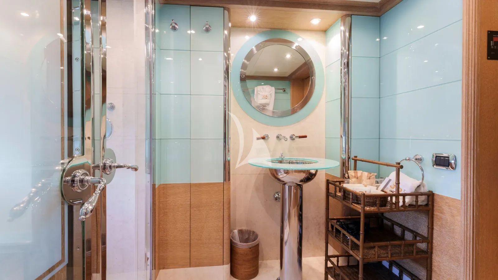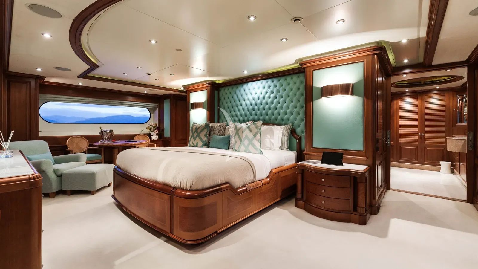 Step inside and discover an interior defined by contemporary Italian influence, soft textures, and generous natural light pouring through the surrounding windows. The saloon and sky lounge offer inviting spaces for connection, each enhanced by thoughtful details like a well-stocked bar and widescreen TV. Evenings end in the comfort of her premium cabins where private bathrooms, refined finishes, and peaceful ambiance help you unwind. The master suite accentuates luxury with a king bed, cozy seating area, large LED TV, and a His and Hers bathroom complete with a bathtub.