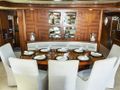 Inside the Main Salon, an expansive living area is equipped with a state of the art entertainment system and custom leather sofas, providing guests with a great place to cool off from the afternoon sun. Behind the seating area is a large wooden dining table with beautifully padded seating for all of your guests to enjoy a delicious meal prepared by the crew.