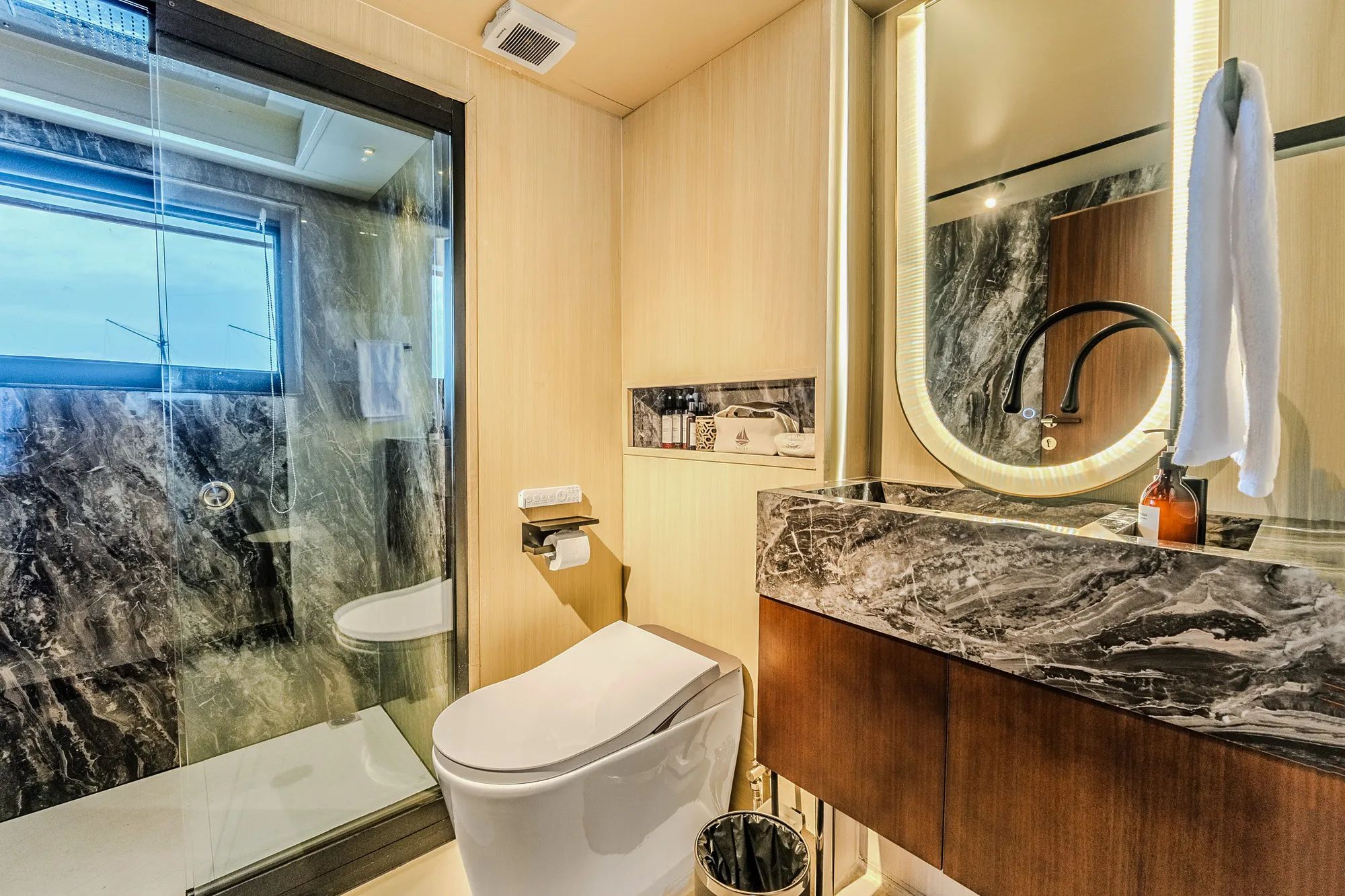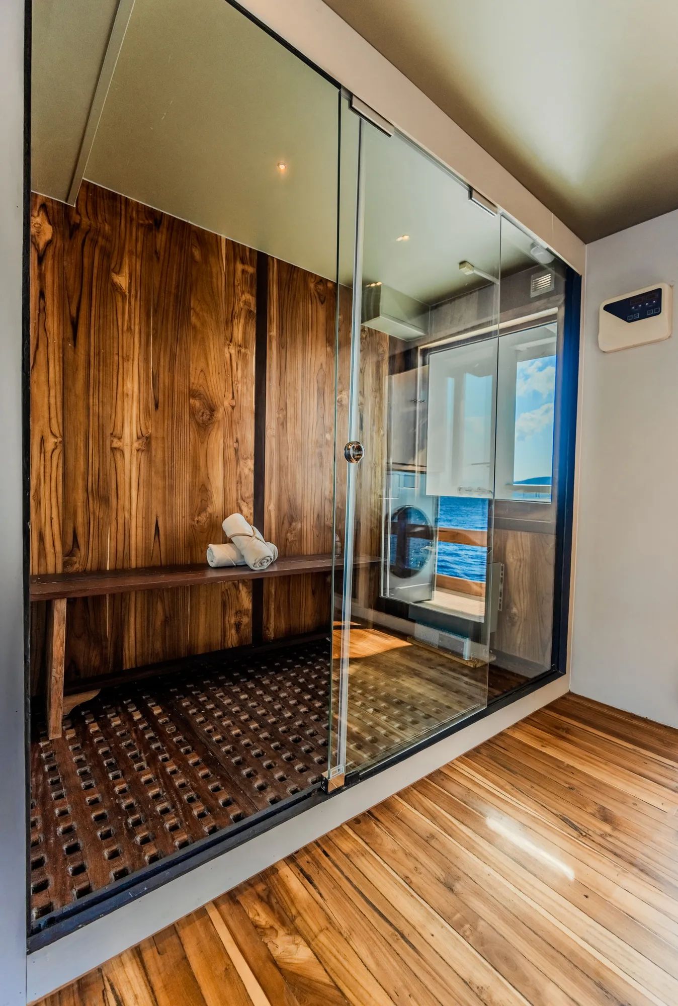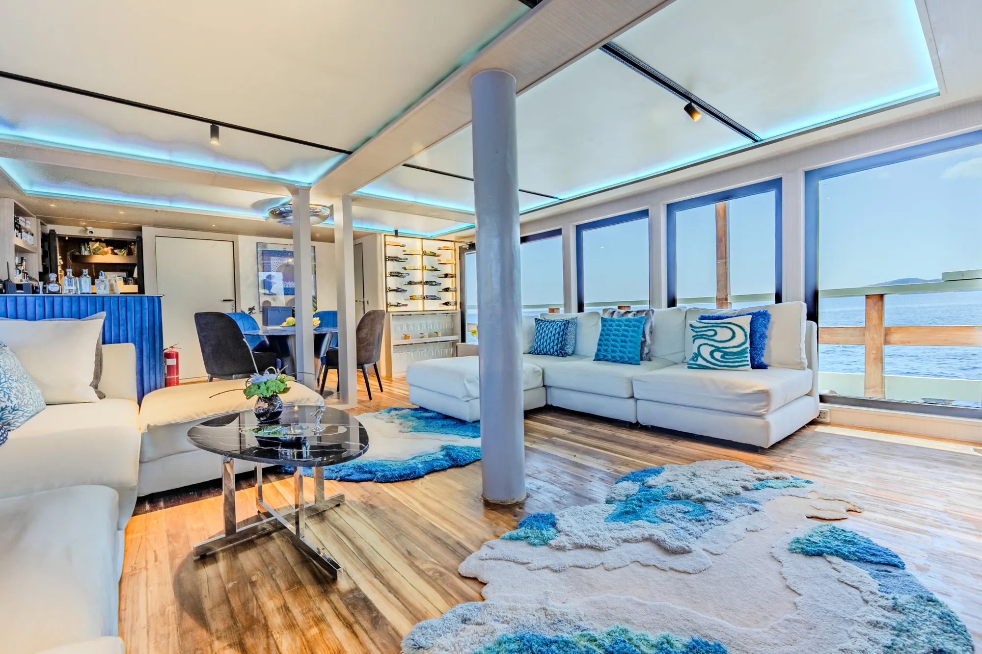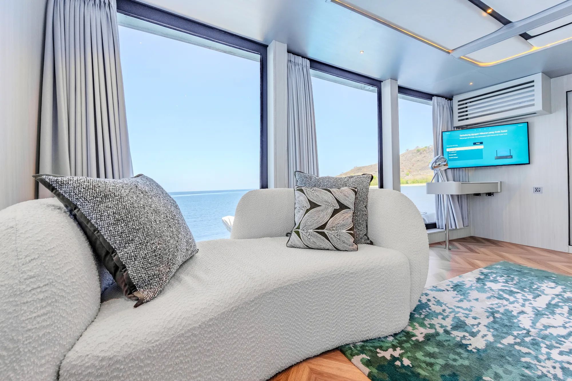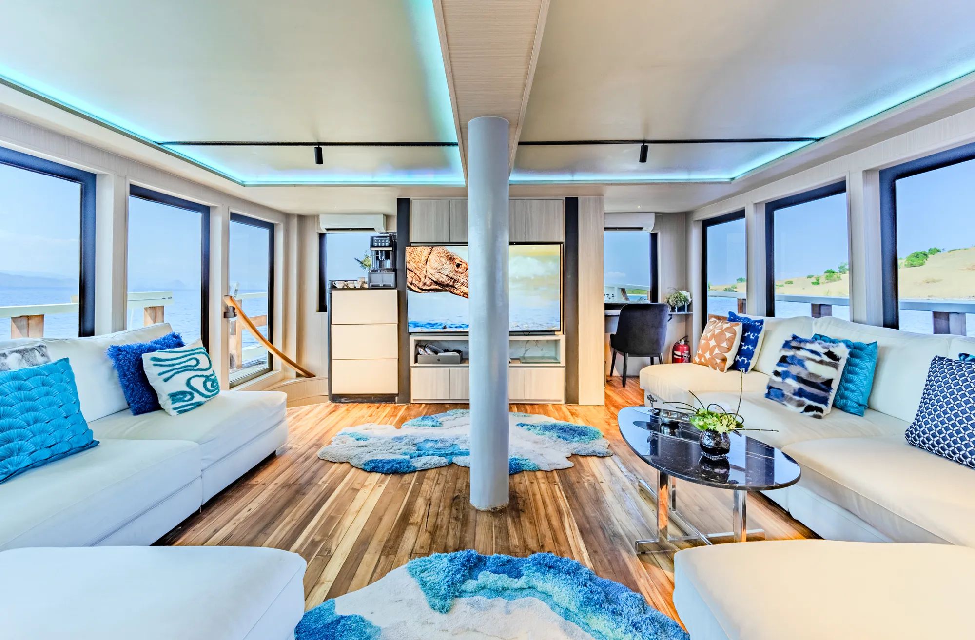 Inside, warm teak finishes and expansive glass windows create a bright, airy atmosphere that feels both comfortable and refined. The saloon and dining areas invite relaxed gatherings, whether you are sharing photos from the day or enjoying a calm night in with a drink and quiet music. The galley keeps everything flowing with beautifully prepared dishes served throughout the day, adding a sense of ease to every moment onboard. Retreat to spacious cabins with private en-suite bathrooms, including a master cabin with a king bed facing floor-to-ceiling windows and a marble ensuite with its own bathtub that turns rest into a highlight.