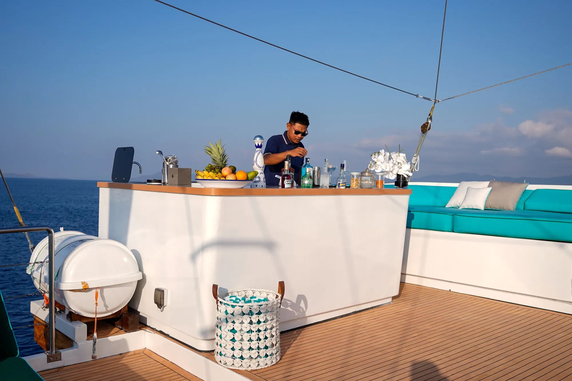 Even the smallest details are handled with care by Stewardess Eva Pratiwi, whose professional service is reinforced by Basic Safety Training, Advanced Firefighting, and Security Awareness certifications. I Putu Oky Saputra, certified as a PADI and RAID Divemaster and known for liveaboard expedition leadership, supports safe and immersive underwater experiences, while Barman I Wayan Putra Wijaya brings polished bar service and an easygoing presence. Deckhand Basri keeps deck routines steady with decades of experience, and Masseuse Made Ayu Sangyang Sari Kerti adds restorative Balinese wellness treatments that leave you feeling fully reset before the next Komodo day begins.