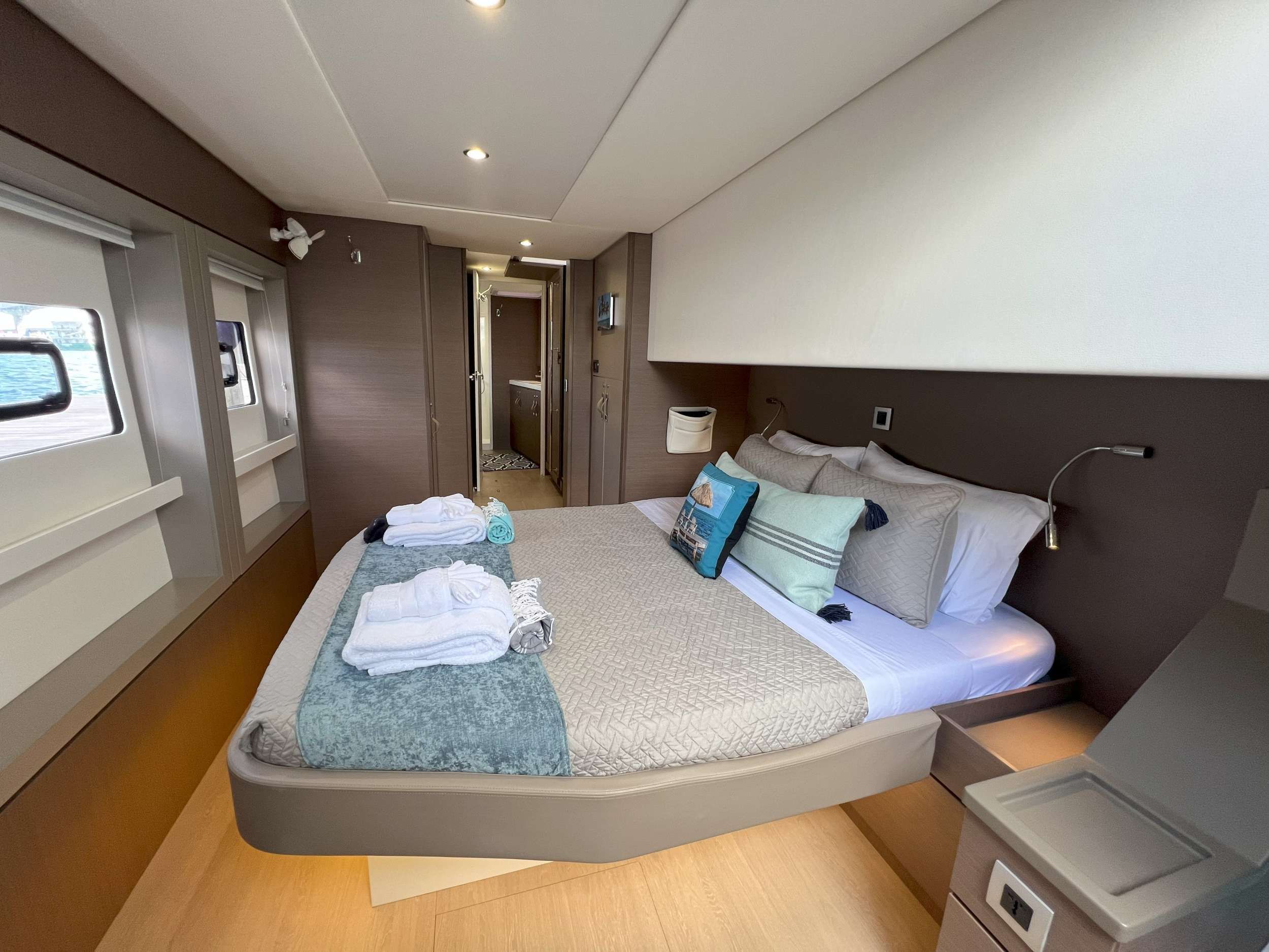 Moving indoors, the yacht’s interior feels thoughtfully composed, combining comfort and sophistication in a way that suits both lively social time and more restful moments. The saloon offers a welcoming place to gather, while the cabins provide a calm, private retreat at the end of each day. One of KITTIWAKE’s most appealing features is the innovative aft wall panel, which lifts at the touch of a button and transforms the saloon into an airy, open-plan space that flows directly onto the aft deck and down to the inviting swim platform. Every double cabin includes a private en suite bathroom with modern electric toilets, generous showers, and elegant vanity areas, giving guests the privacy and convenience that make a real difference over the course of a charter.