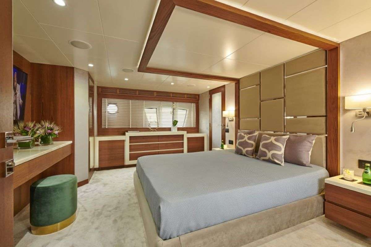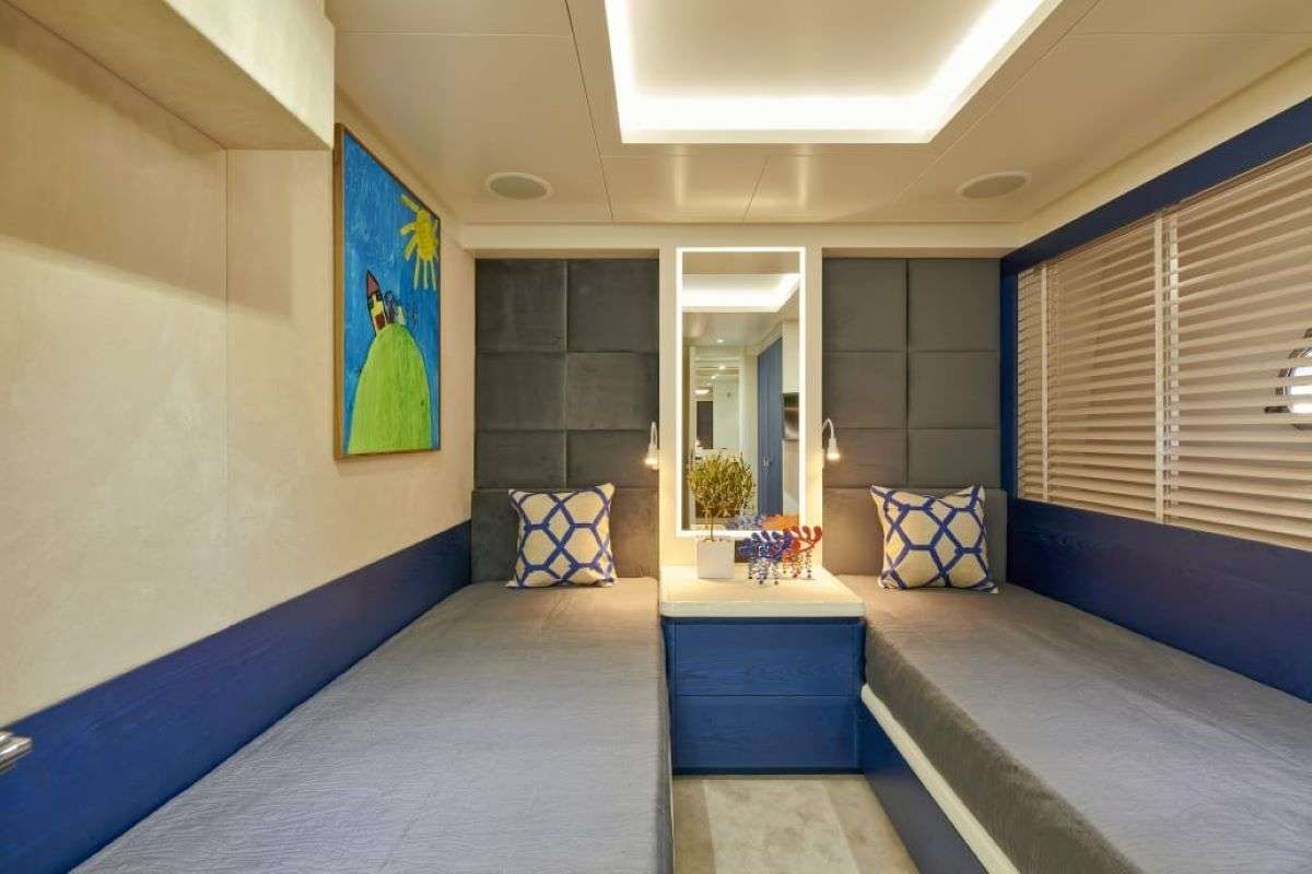 Inside, LA FENICE reveals a welcoming arrangement that is clearly designed with groups in mind. Three queen cabins provide refined retreats for couples or older guests, while two twin cabins are perfect for children, teenagers, or friends sharing, ensuring that everyone enjoys a generous slice of personal space. Each cabin is enhanced by its own ensuite bathroom, keeping the flow of the day smooth, while the modern galley anchors the heart of the yacht with all the equipment needed for your chef to produce mouthwatering dishes that match the tone of your charter.
